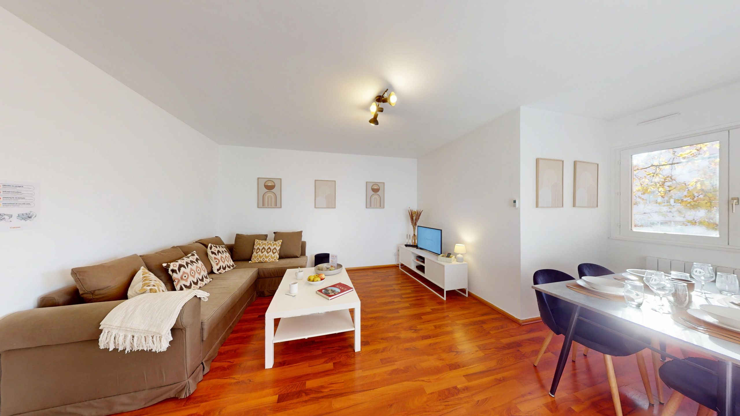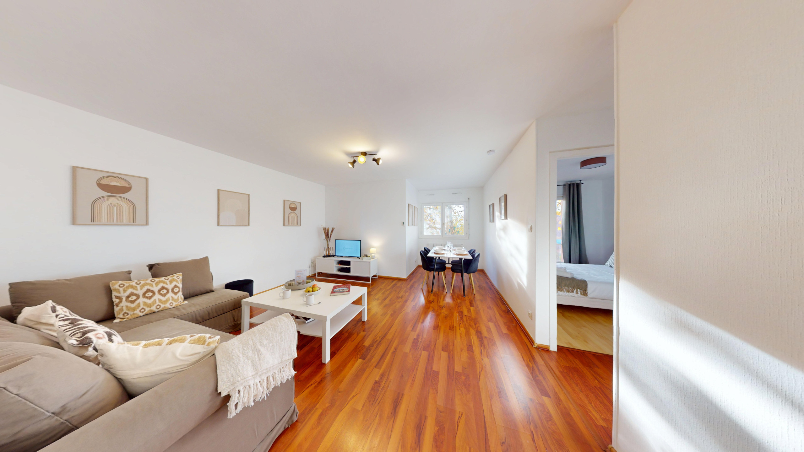 - Wohn- und Esszimmer: Schlafsofa, Fernseher, gemütlicher Essbereich