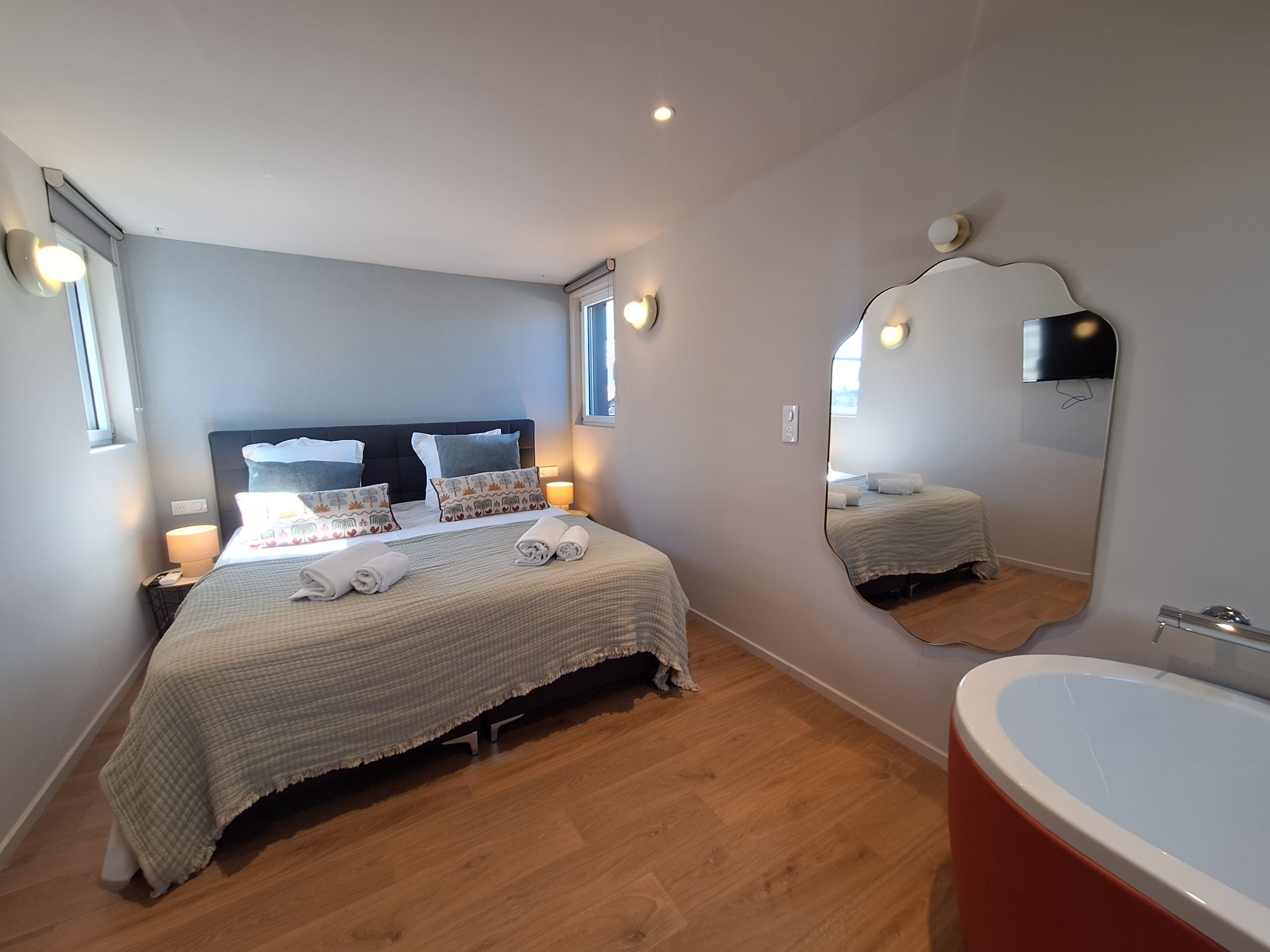 Sie verfügen über einen großzügigen Wohnbereich mit ausgestatteter Küche (Nespresso-Maschine, Kochplatte, Mikrowelle, Minikühlschrank, Wasserkocher), einem Schlafzimmer mit einem 160x200 cm Bett mit Badewanne und einem Badezimmer mit Dusche und Toilette. Der Wohnbereich ermöglicht auch eine Schlafgelegenheit für 2 Personen durch ein 160x200 cm Bett.