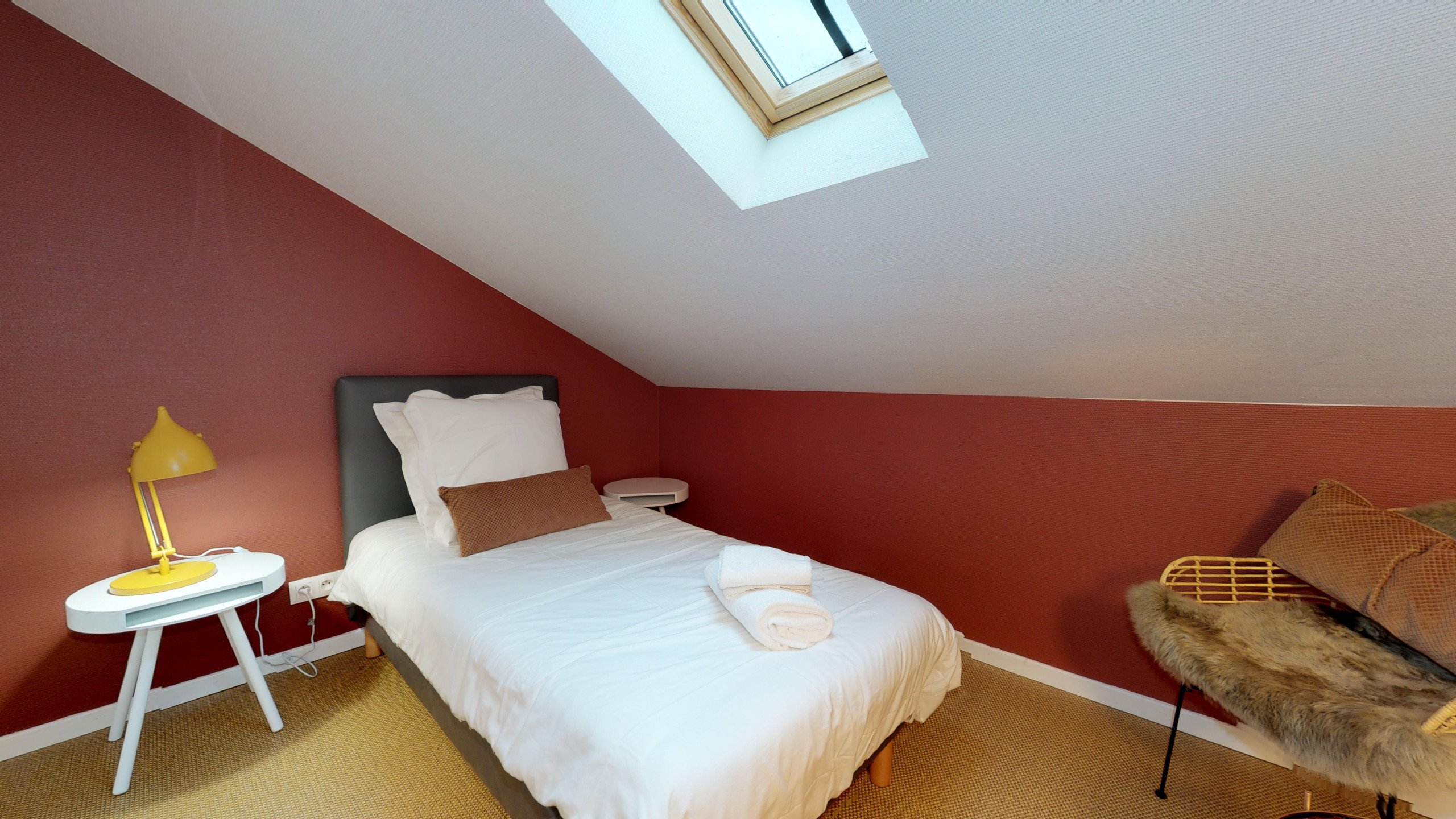 Ein Schlafbereich mit einem Einzelbett befindet sich im Zwischengeschoss.