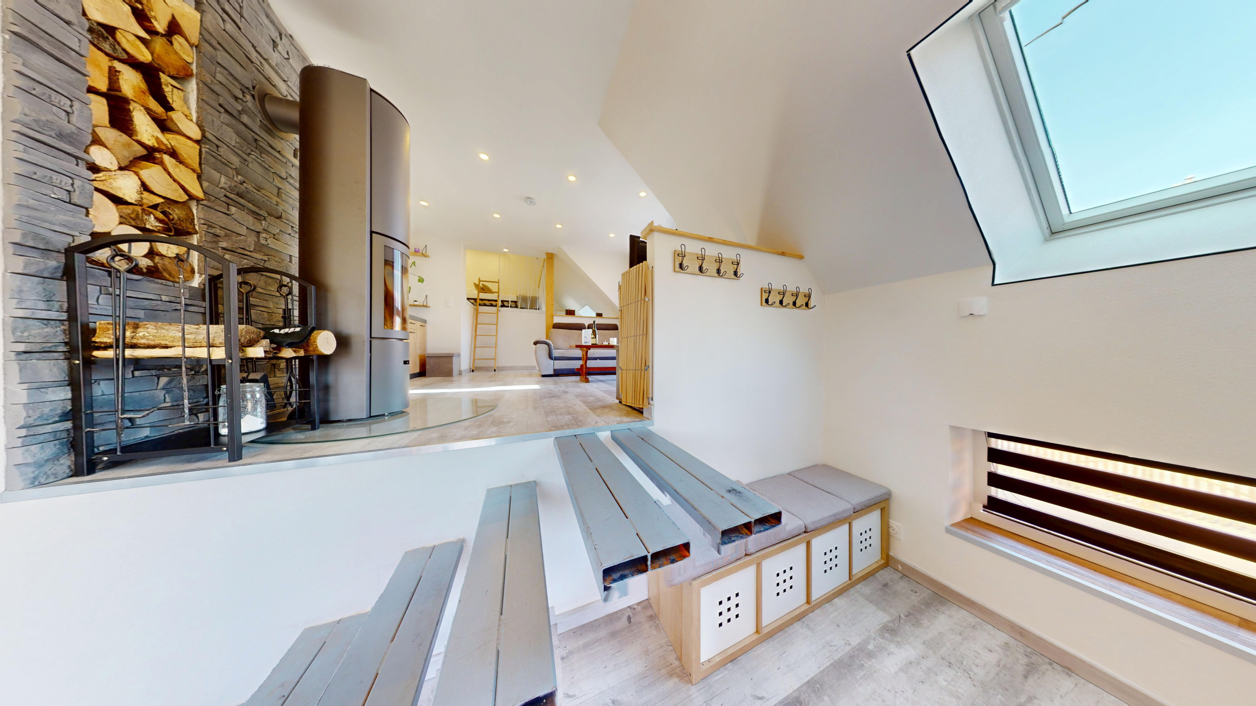 🛏️ In der Zwischenebene befindet sich ein zweites Schlafzimmer mit zwei Einzelbetten, das über eine Leiter zugänglich ist.