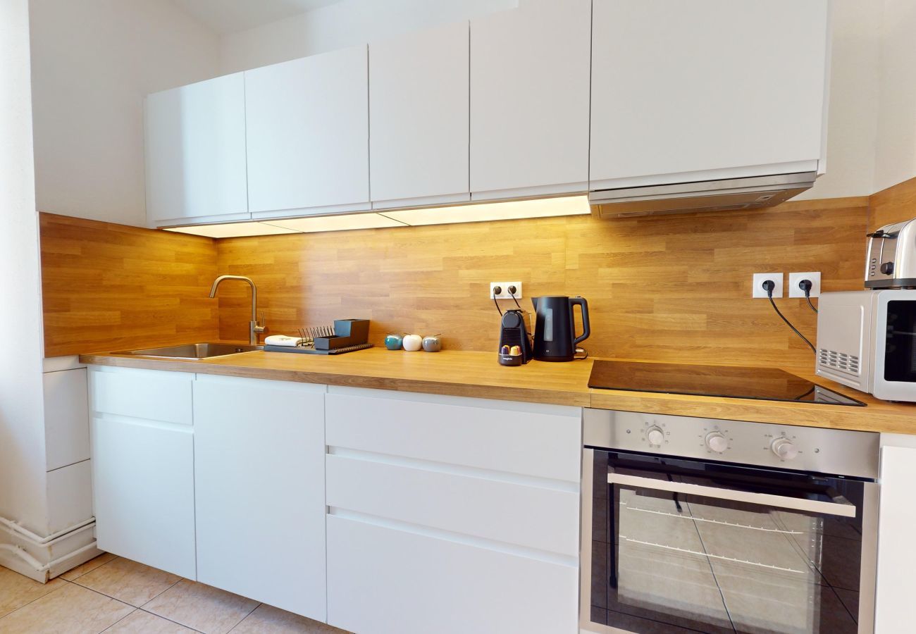 - eine voll ausgestattete 🍽️ helle Küche (Kühl-/Gefrierschrank, Herd, Backofen, Mikrowelle, Toaster, Wasserkocher, Filterkaffeemaschine), von der 🌞 Sie Zugang zu einem Balkon haben.