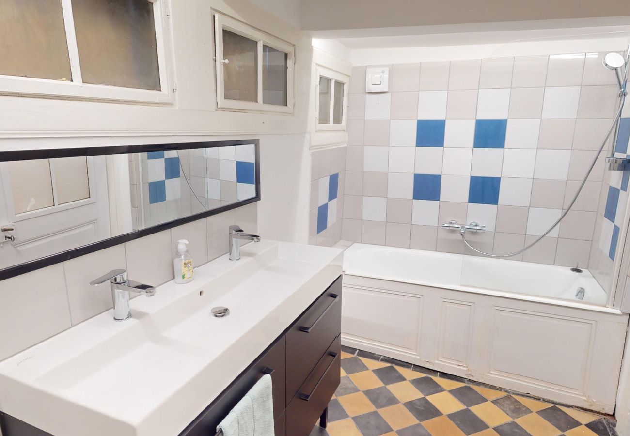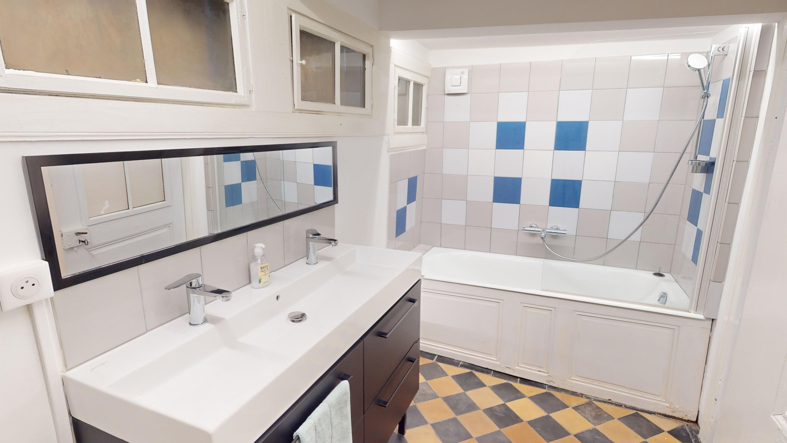* The well-appointed bathroom, with a bathtub and a sink with double basins.