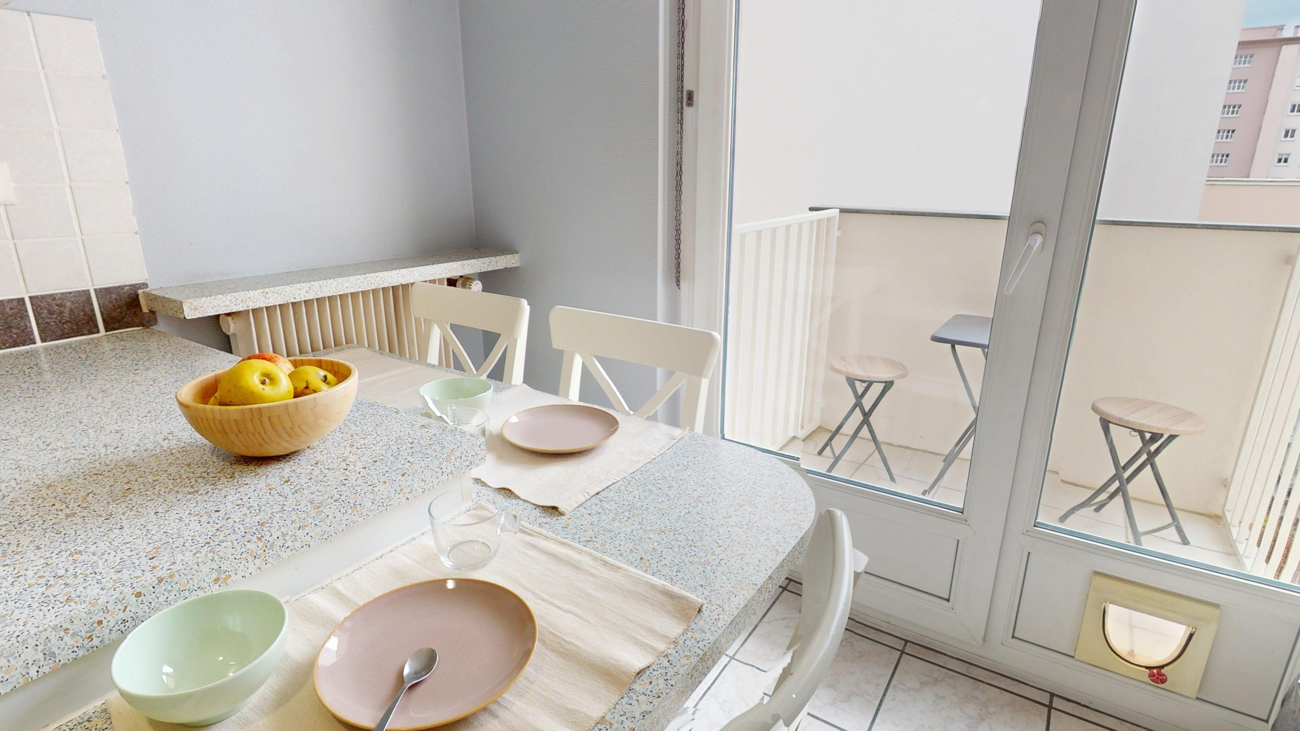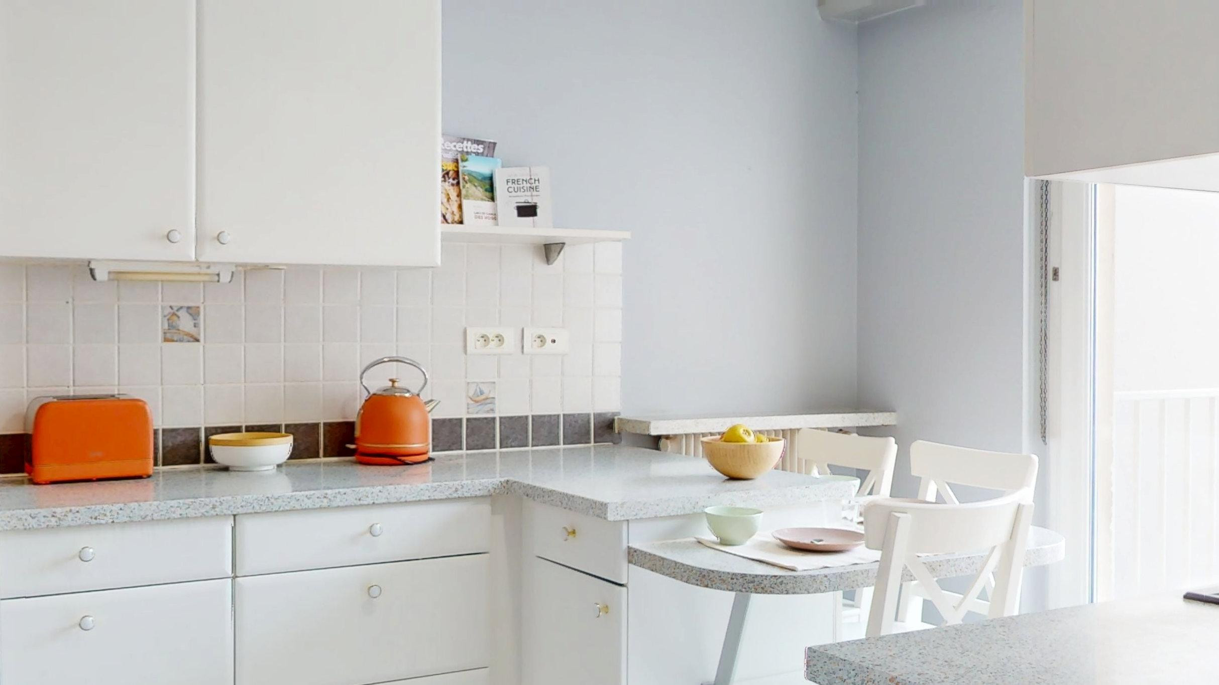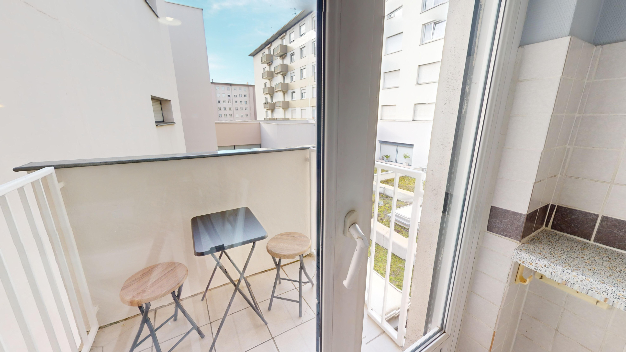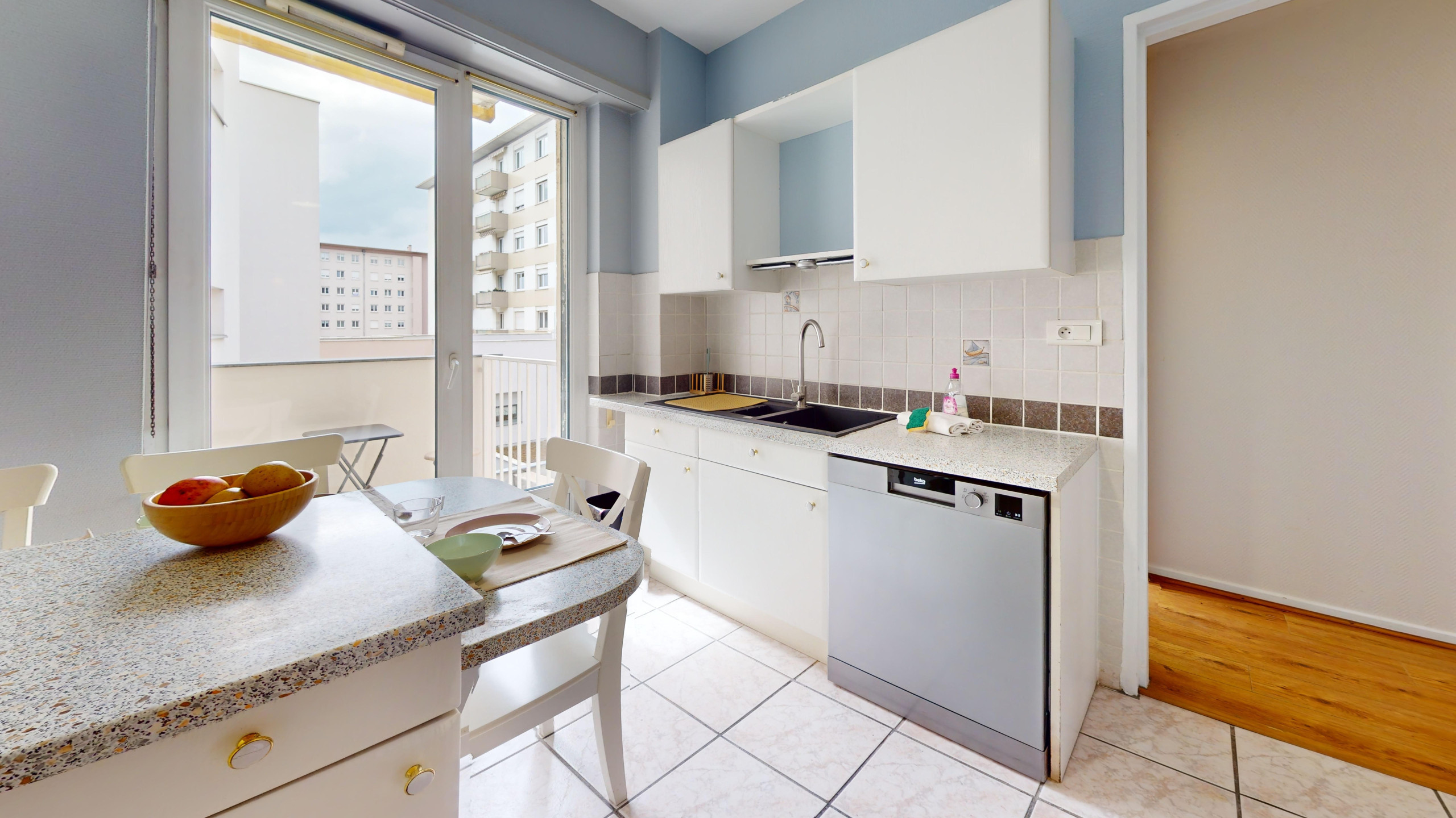 🌞 The kitchen gives access to a small balcony with an electric barbecue.