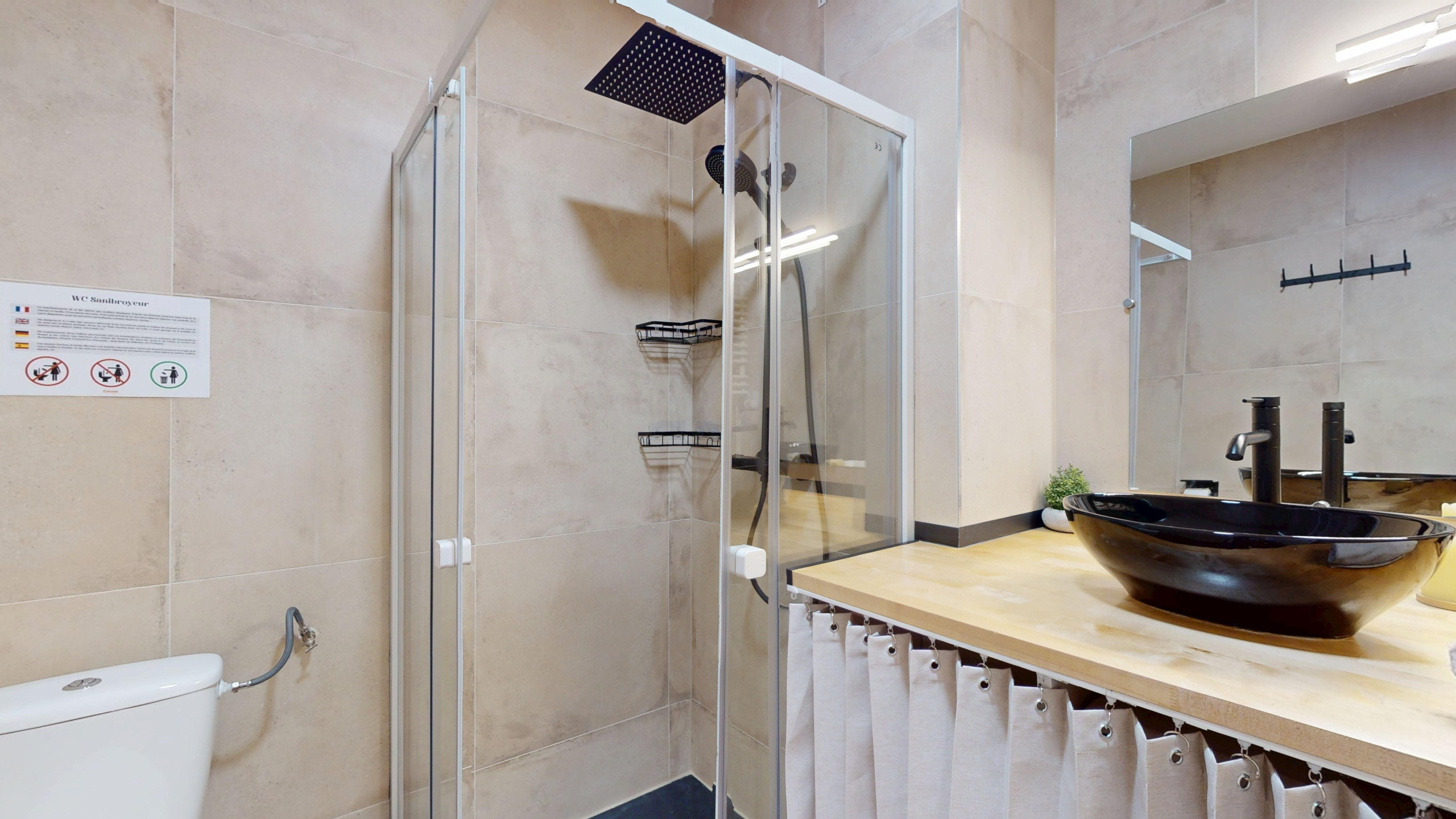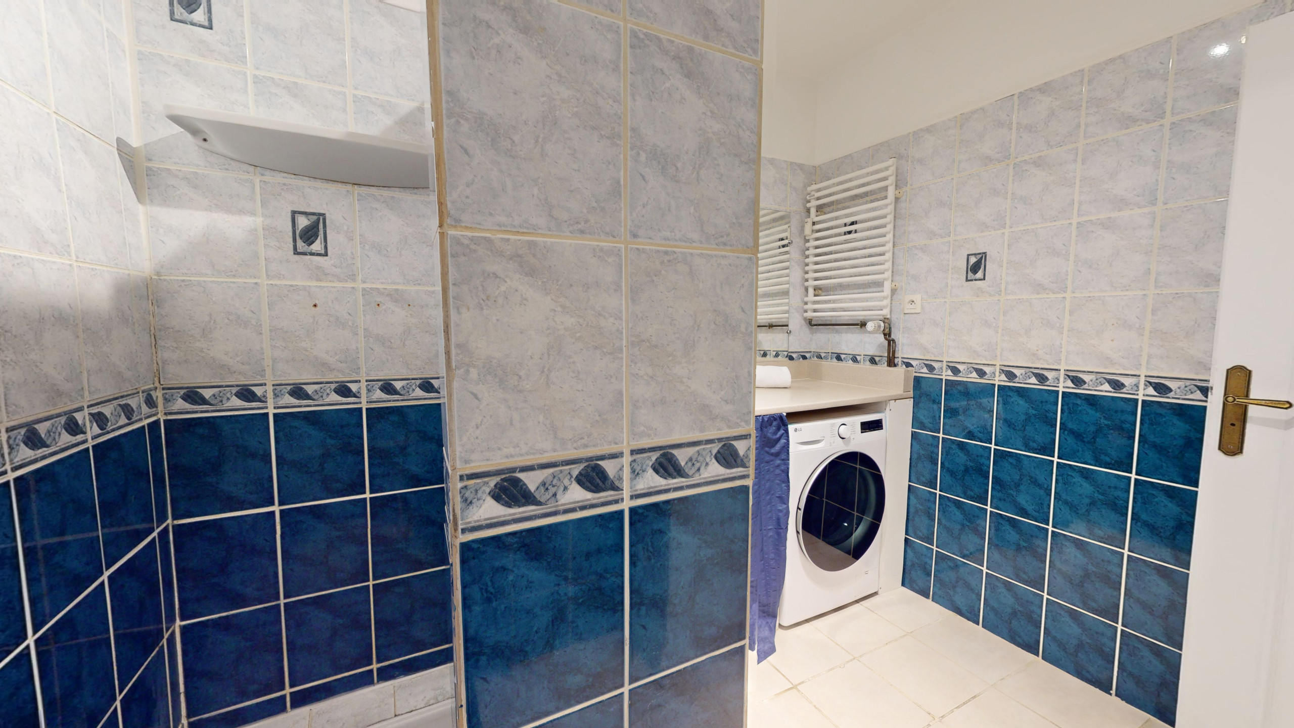 🚿 A bathroom with a shower, washer-dryer.