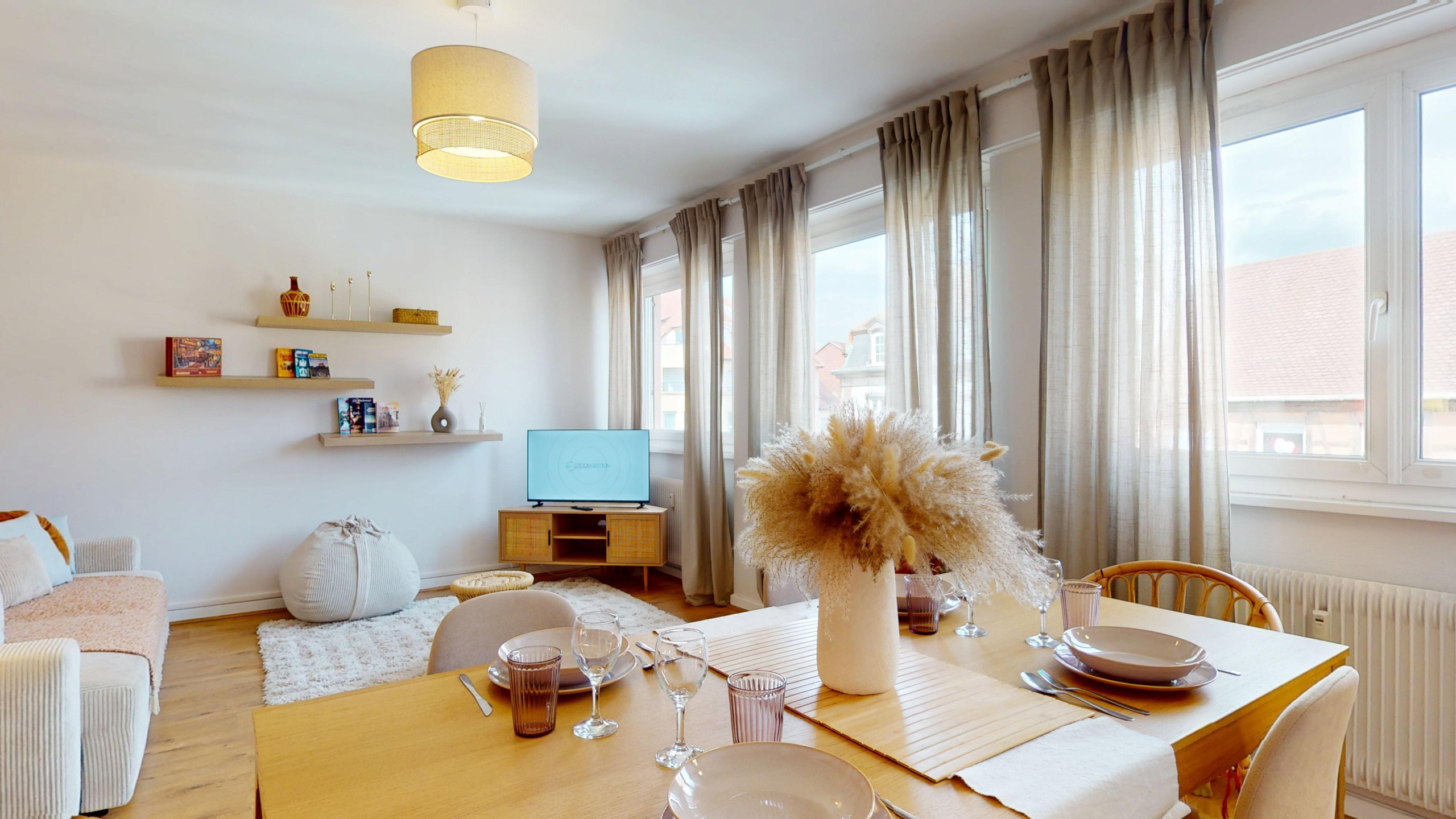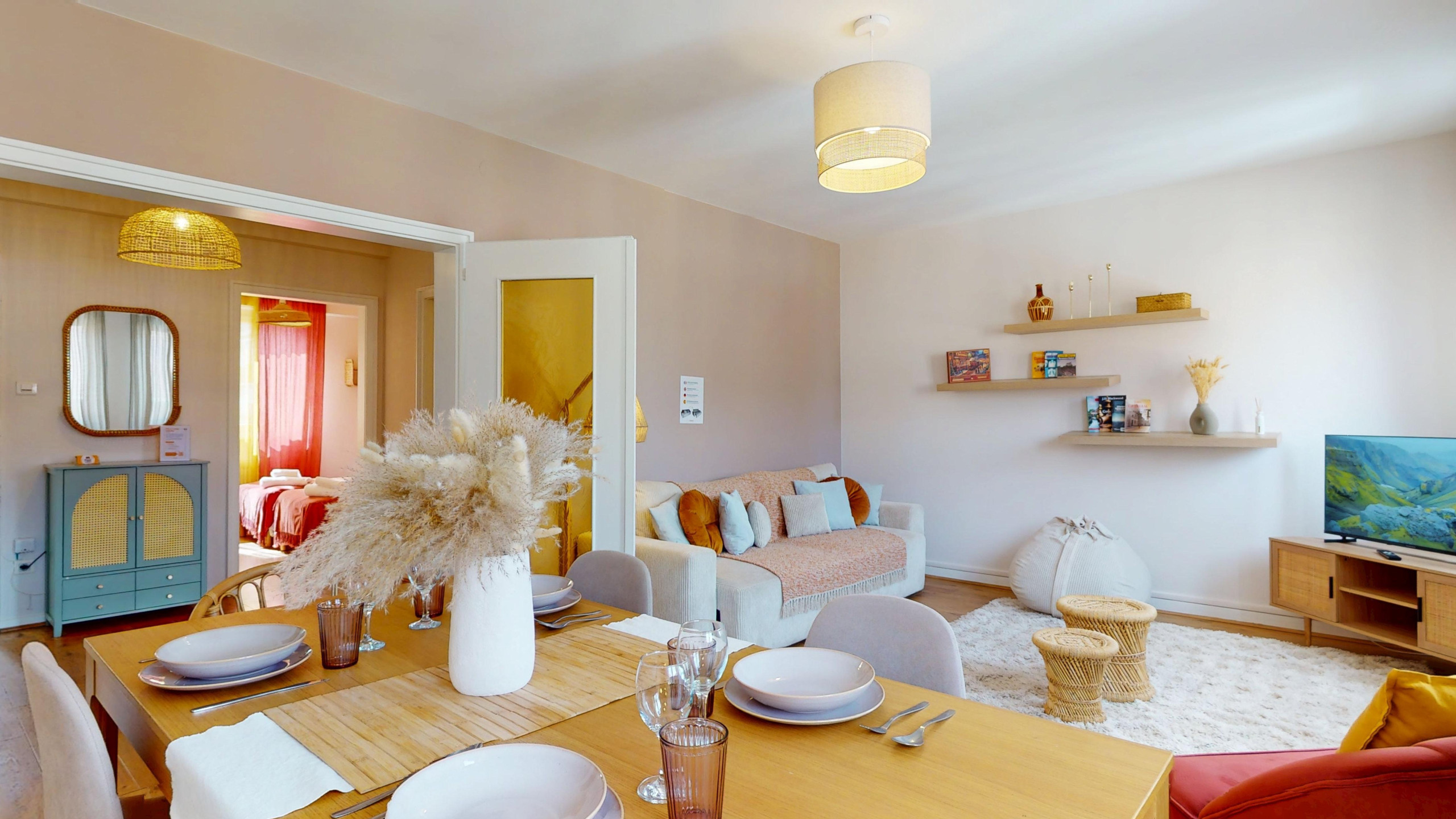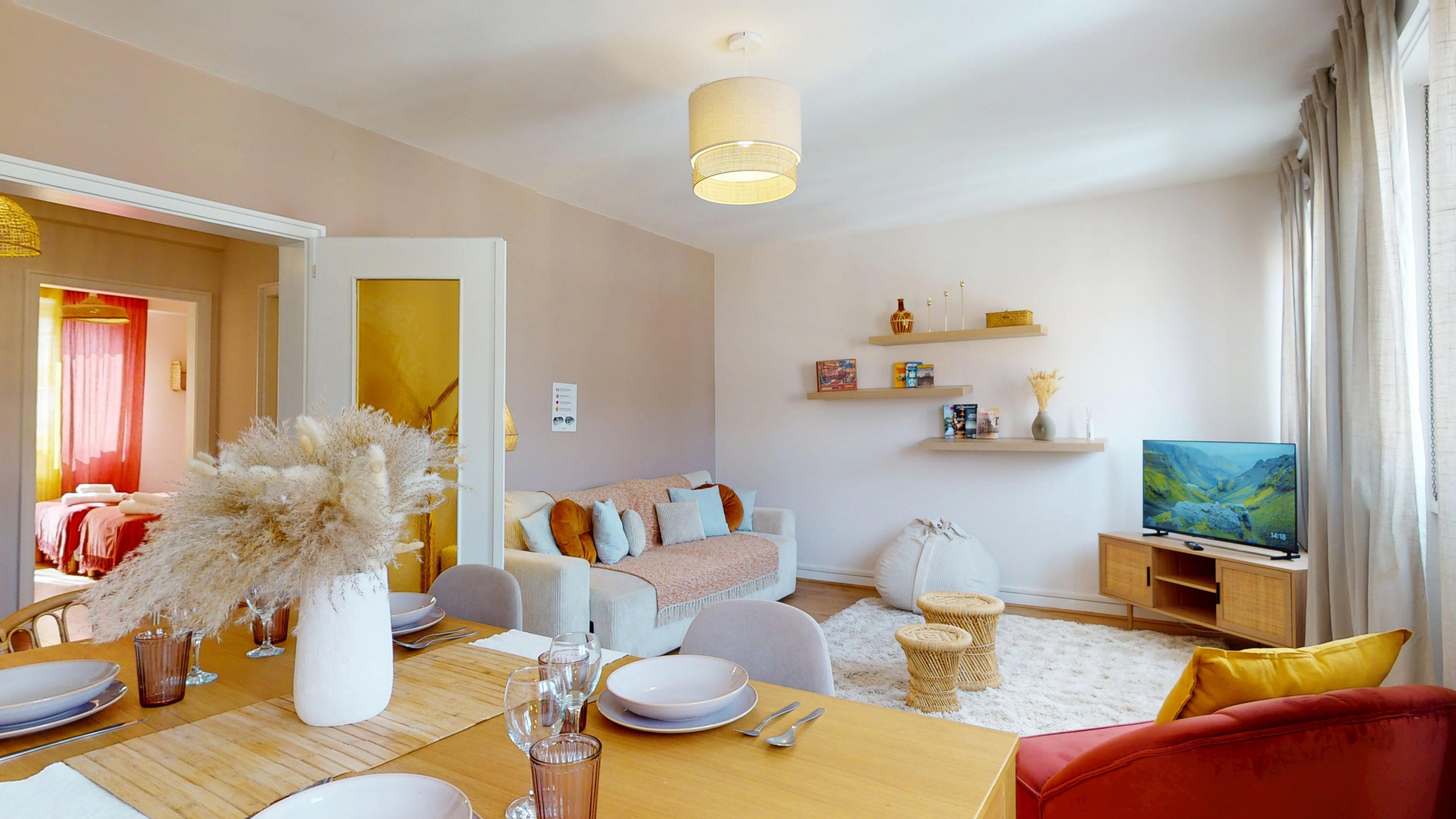 🛋️ A large, bright living room with a seating area (double sofa bed and television) and a dining area with a table for sharing moments of conviviality.