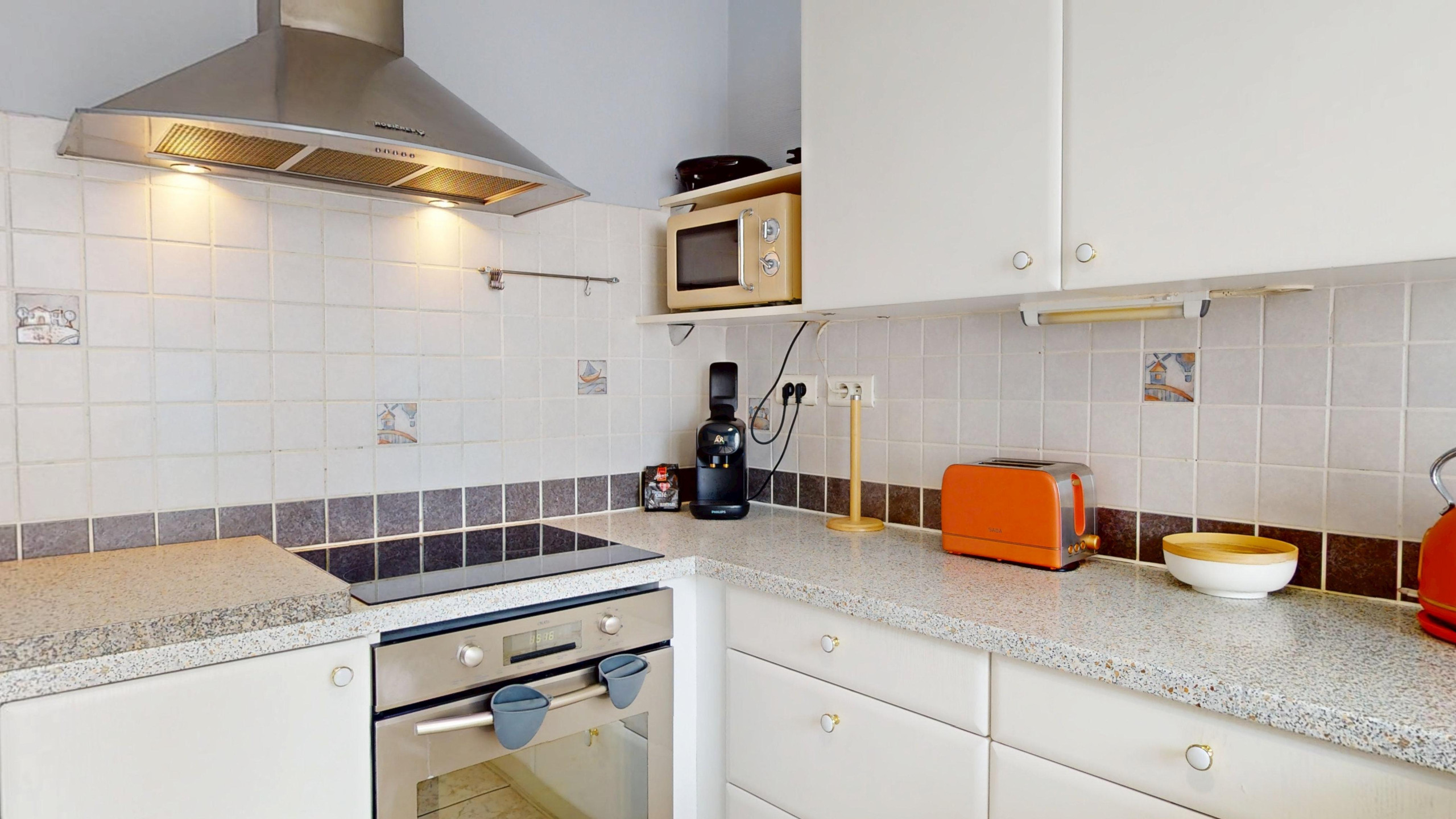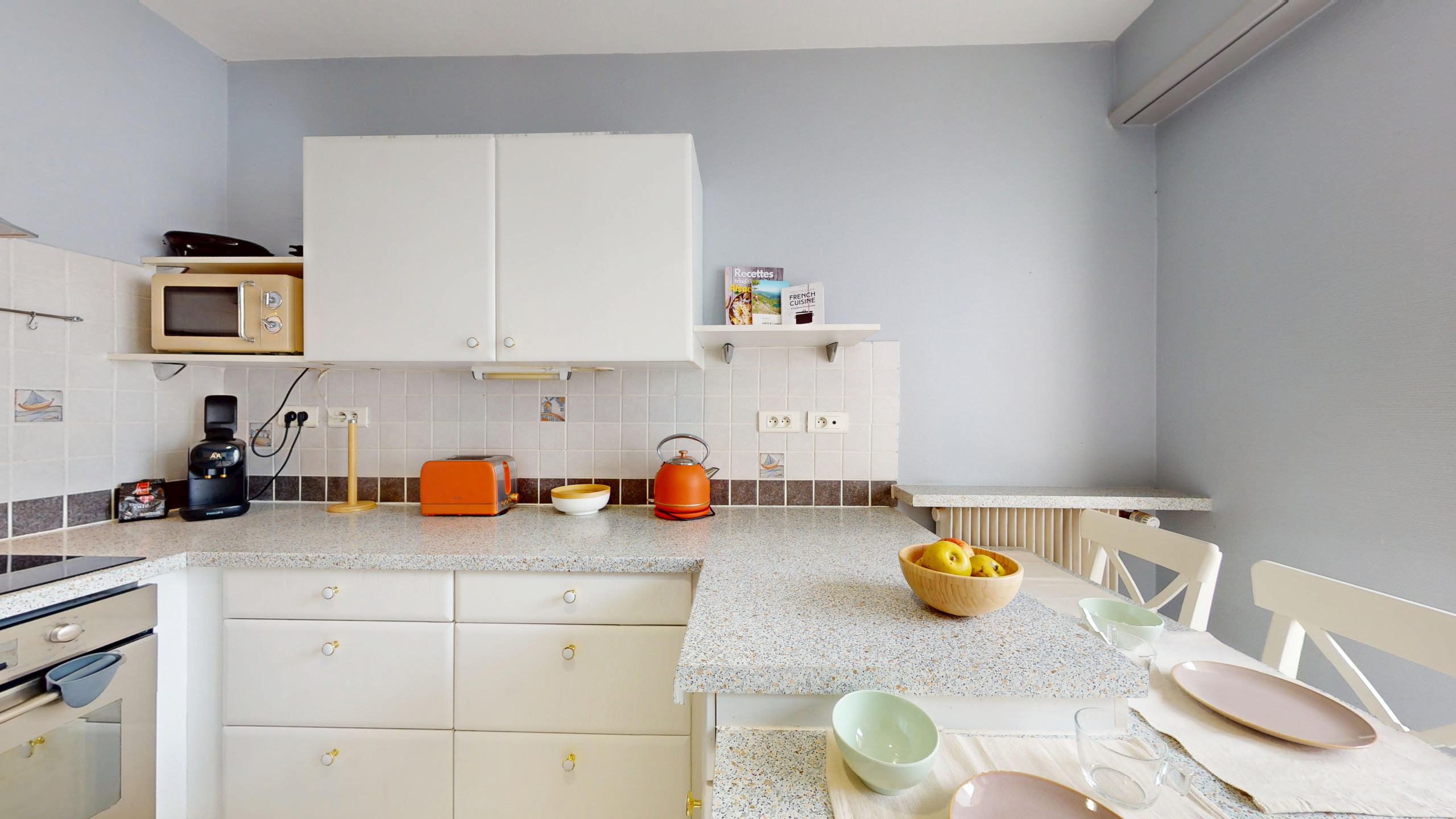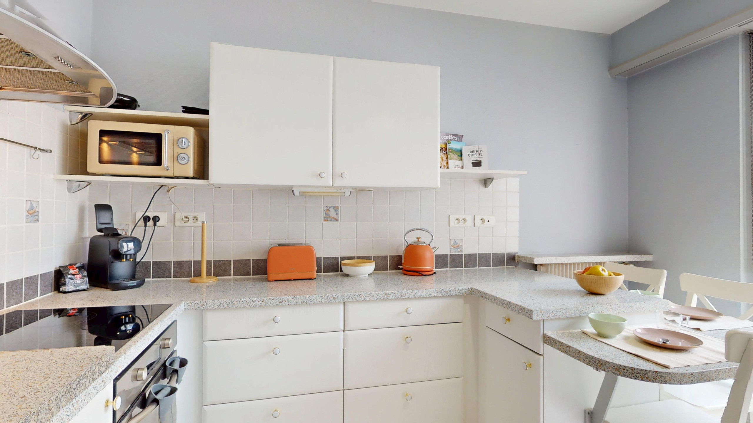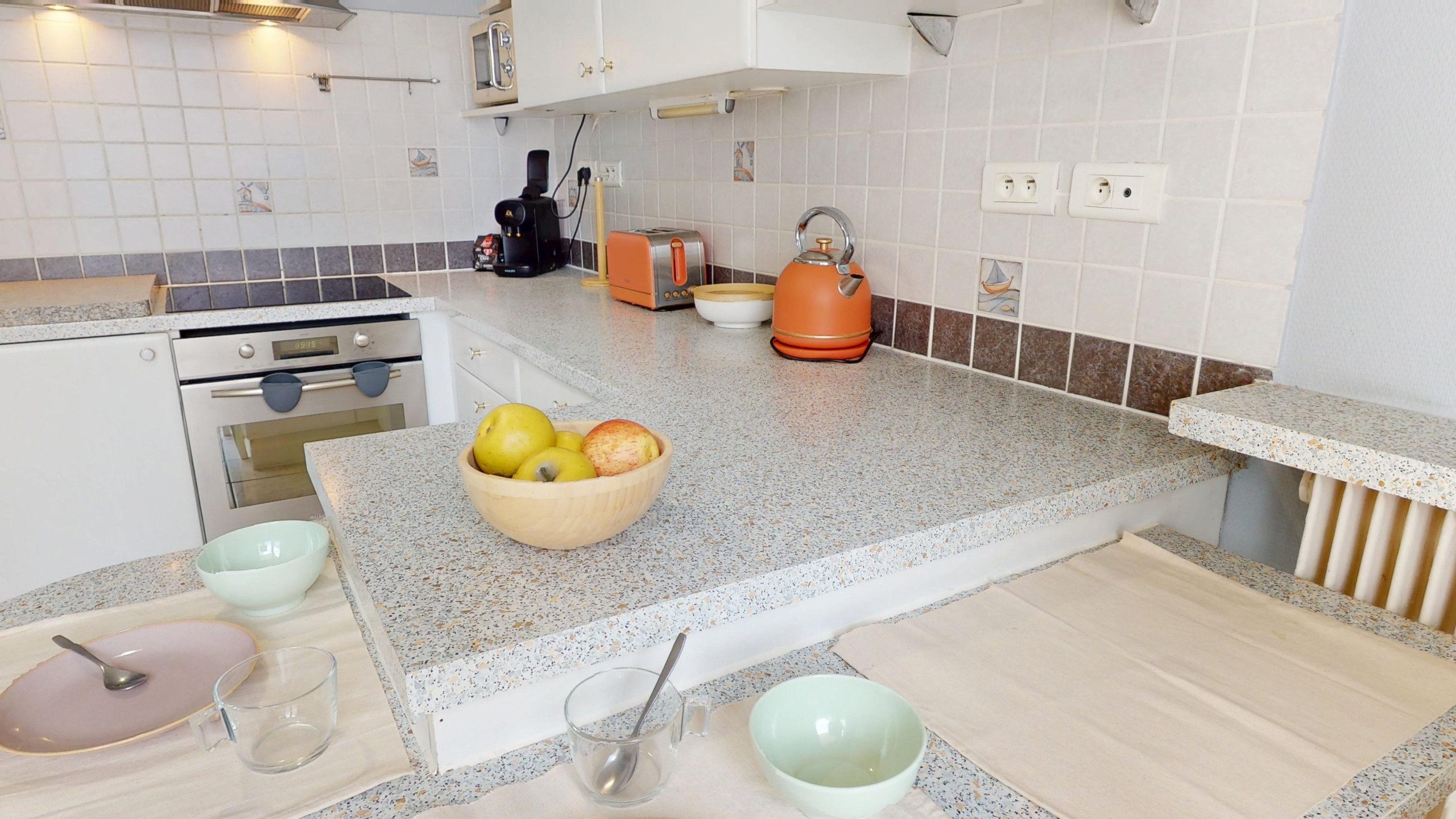 🍽️ A fully equipped kitchen (cooking hob, oven, refrigerator/freezer, Nespresso-compatible coffee machine, dishwasher, kettle, microwave, and toaster) with a dining area for 3 people.