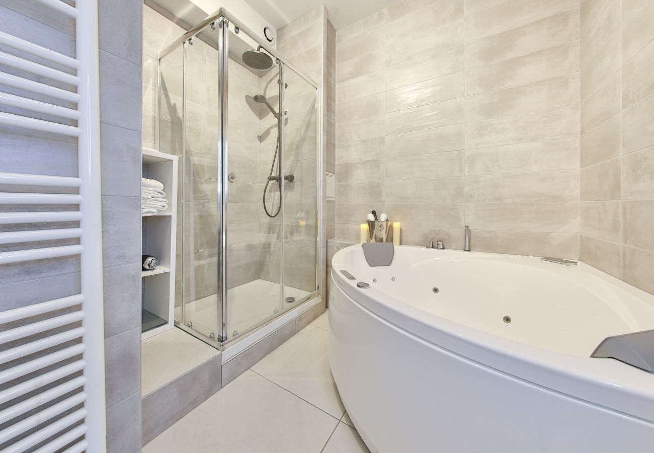 🏡 This apartment has a bedroom with a double bed 🛏️ completed by an office space 💻, a large corner sofa living room 🛋️, and a fully equipped open kitchen 🍽️ (fridge/freezer, hob, oven, micro -waves, dishwasher, washing machine, kettle, toaster, classic Nespresso coffee maker). 🛁 The bathroom consists of a shower 🚿, a double sink and a whirlpool bath 👙. The toilets 🚽 are separated from the bathroom.