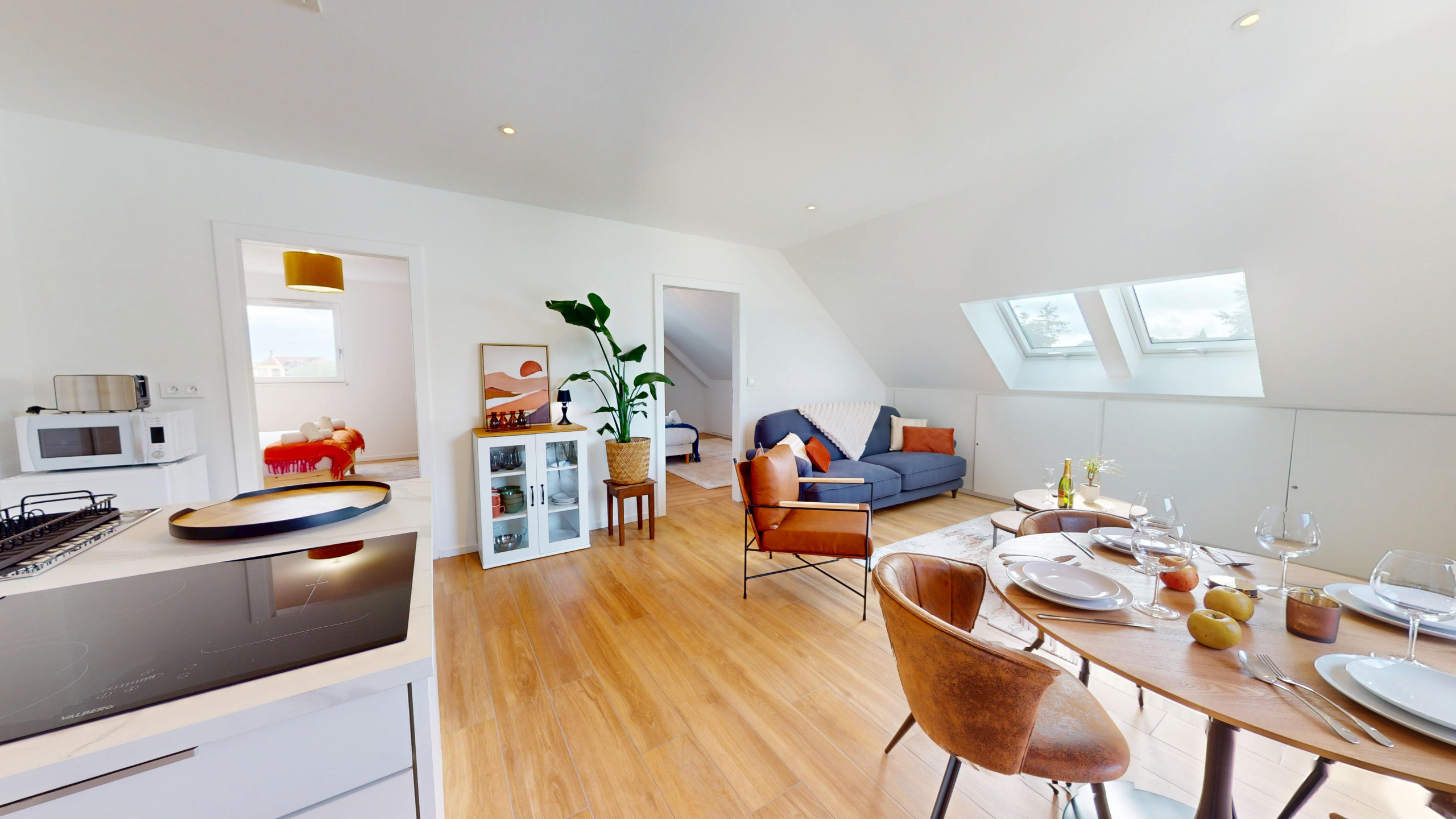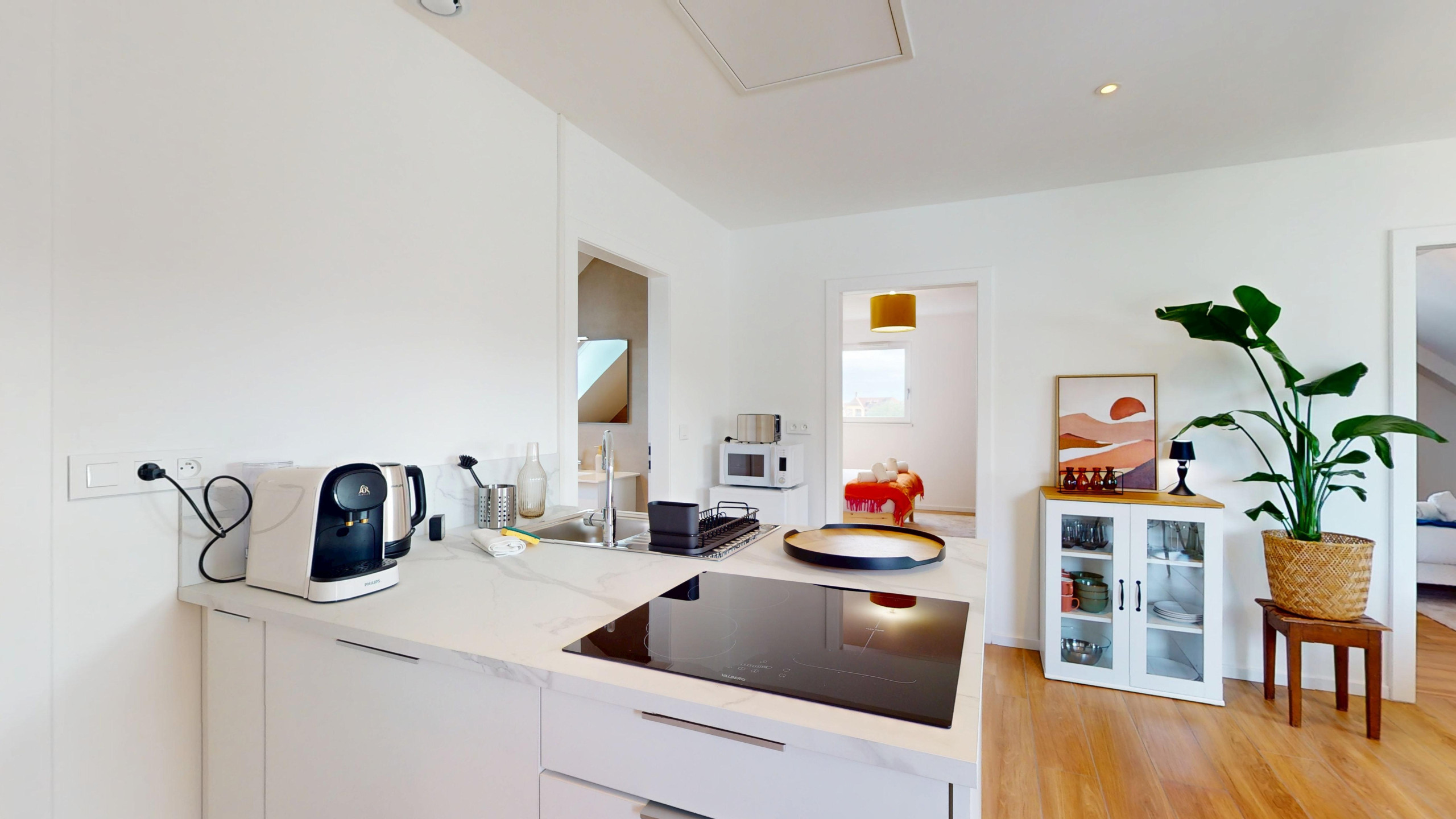 The fully equipped American kitchen will allow you to easily prepare your meals during your stay. It notably includes an induction hob, a refrigerator, a microwave, a dishwasher, a coffee maker, a kettle and a toaster, as well as all the crockery and utensils necessary for cooking.