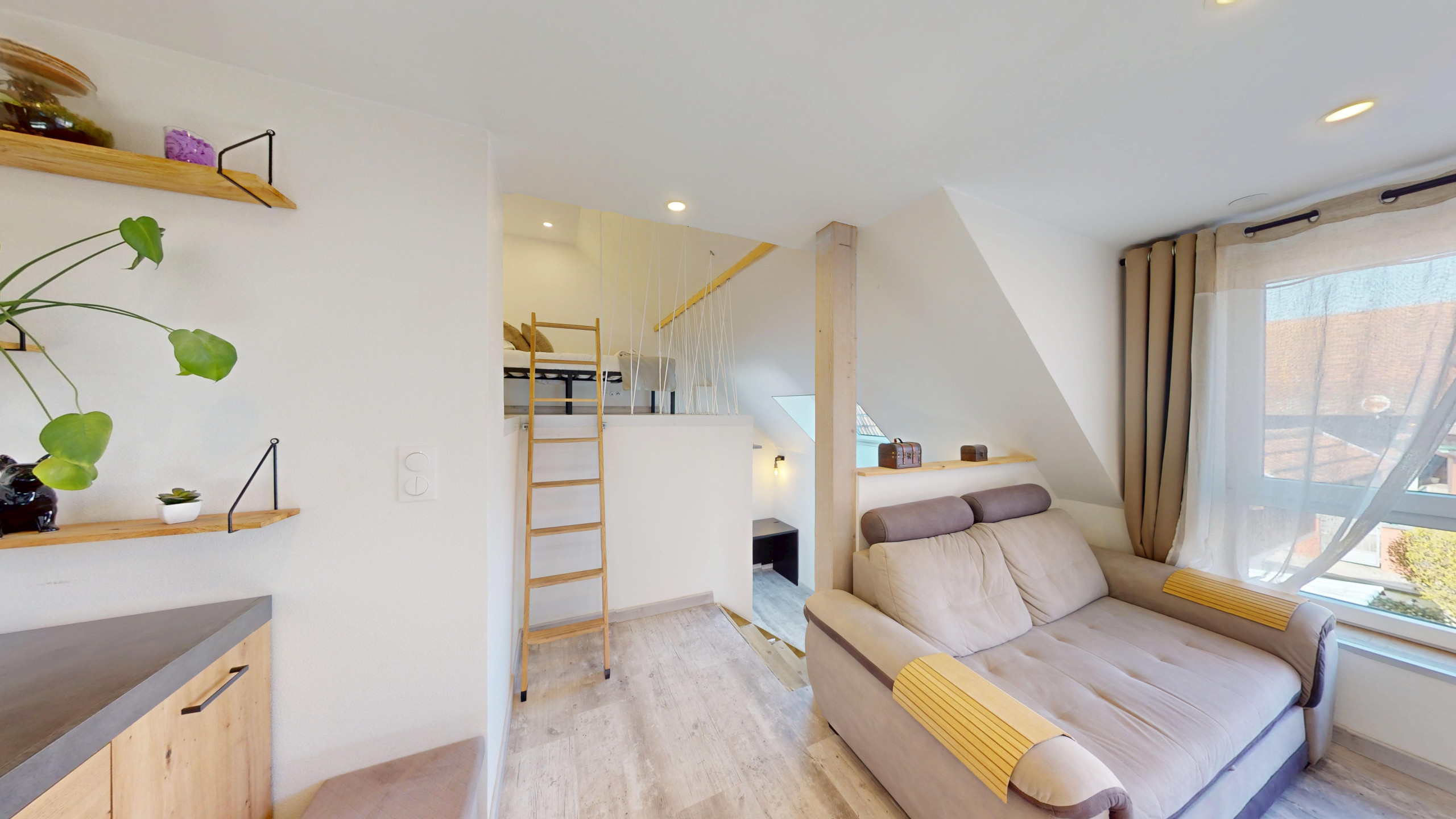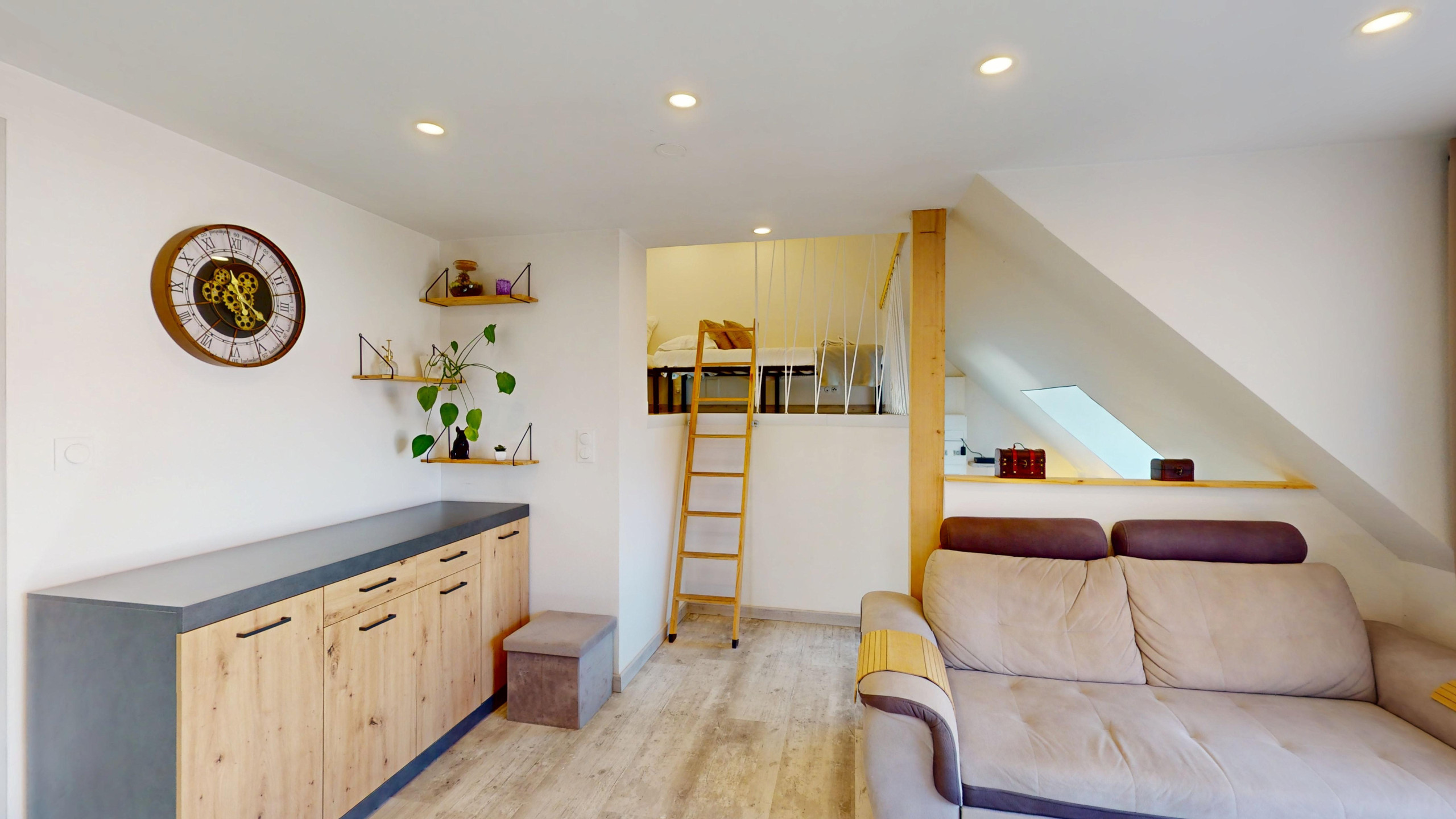🛏️ On the mezzanine there is a second bedroom with two single beds accessible by a ladder.