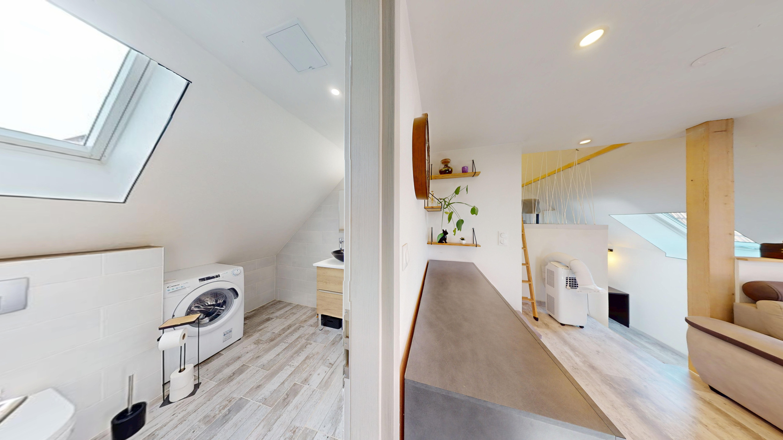 🛀 A bathroom with a walk-in shower, a toilet and a washing machine.