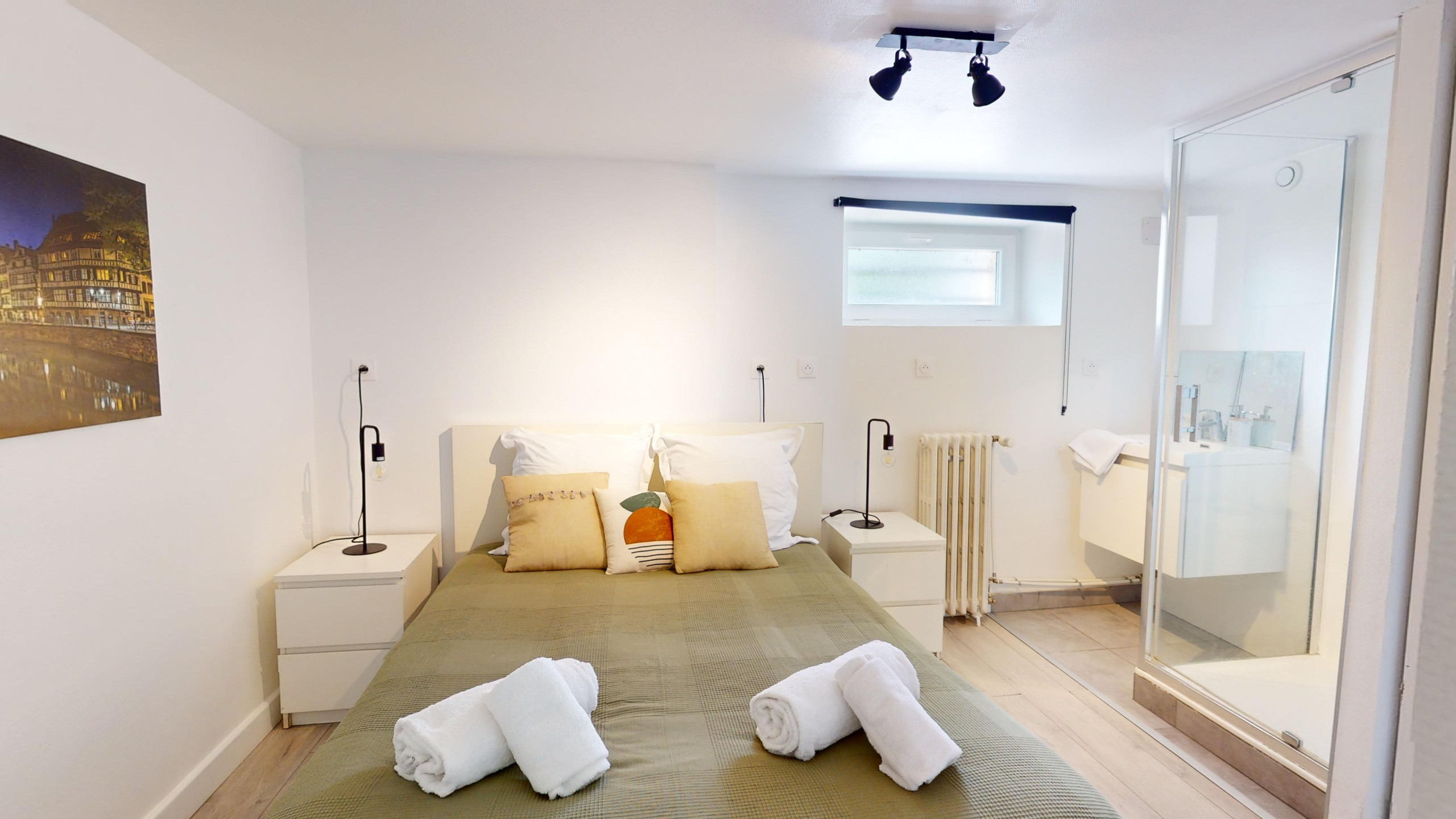 🛏️ 🚿 a second bedroom with a double bed and storage, and its bathroom with shower, open to the bedroom