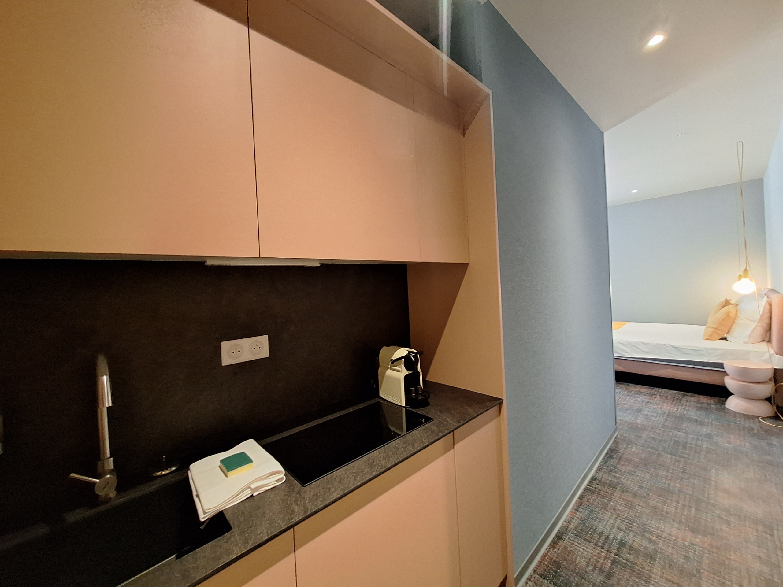 You benefit from an optimised space with a double bed 160x200, a fully equipped kitchen (Nespresso machine, hob, microwave, mini fridge, kettle) and a bathroom with shower and toilet.