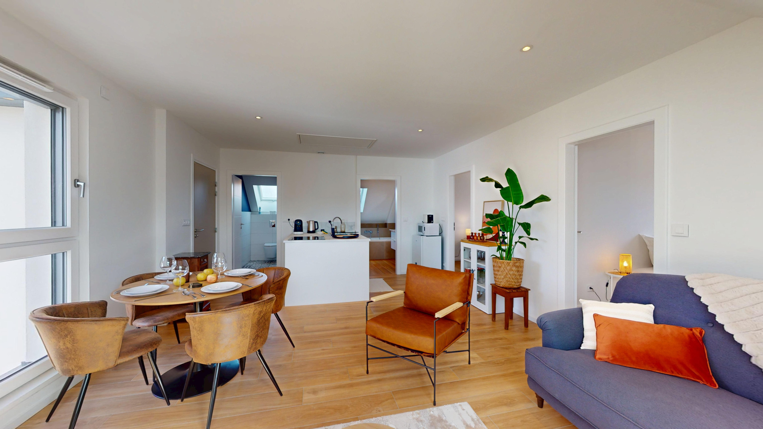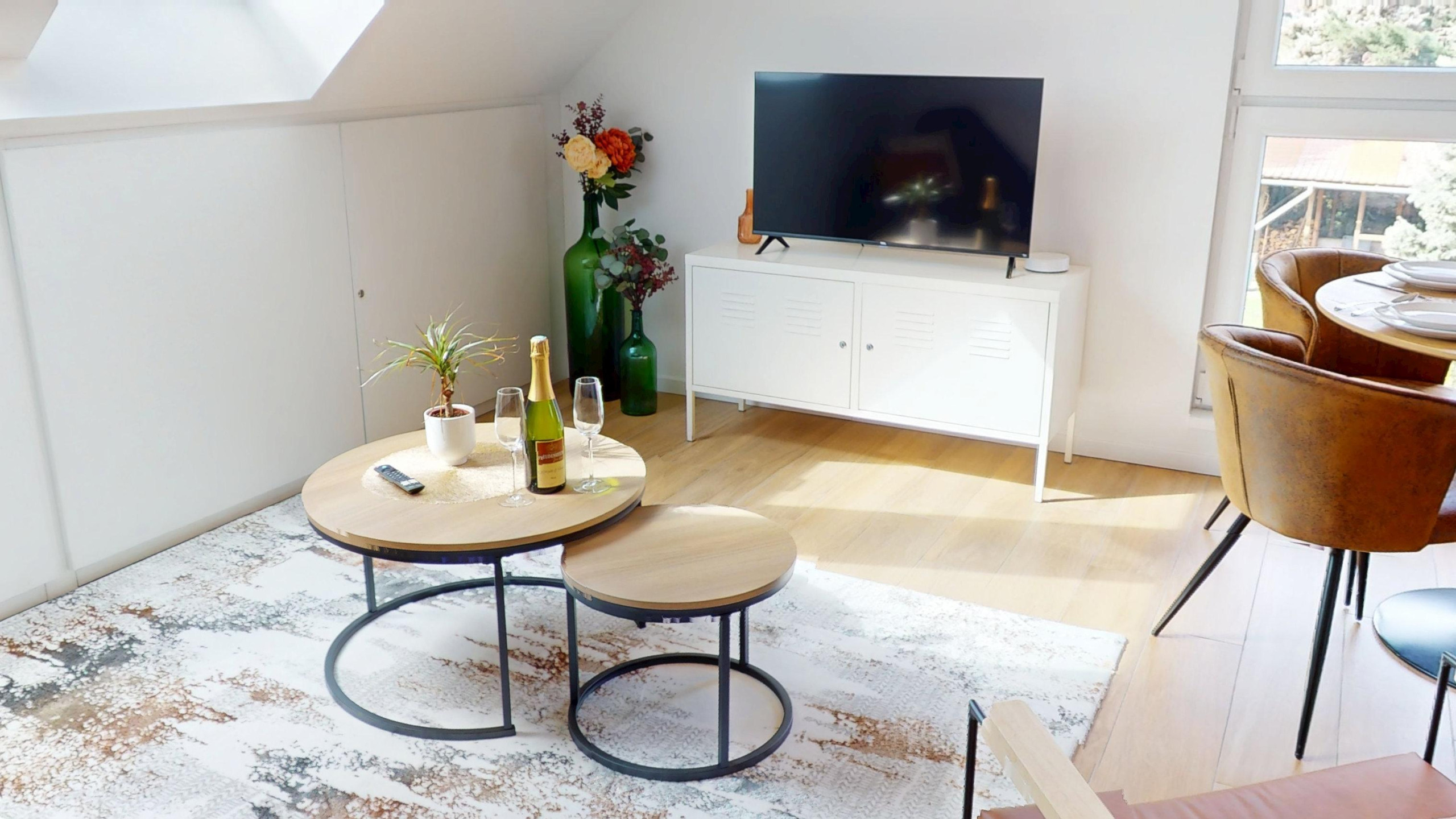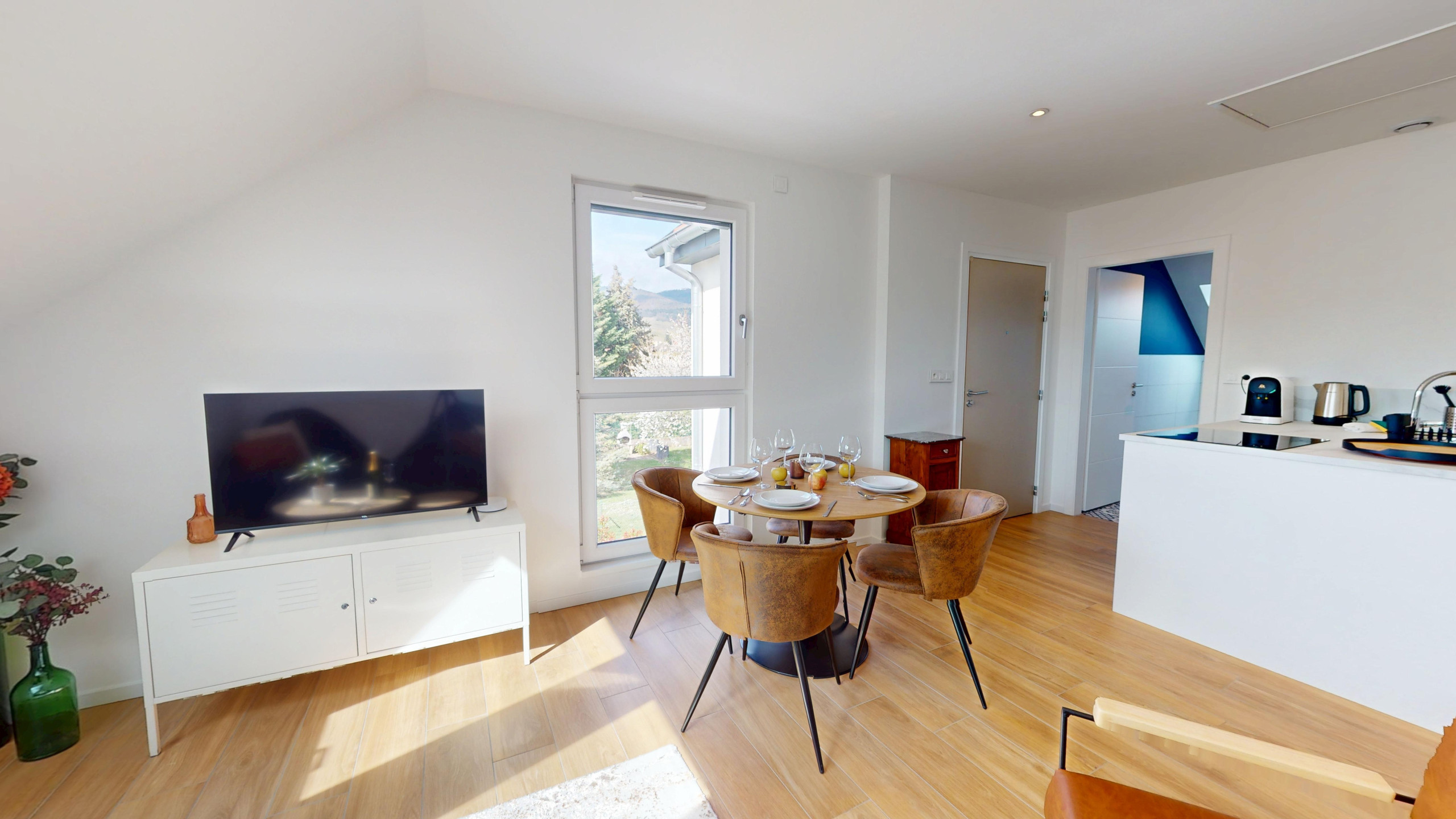 El alojamiento ofrece una zona de estar acogedora y agradable, perfecta para relajarse después de un día de descubrimiento en los pueblos alsacianos. Podrá disfrutar de un espacio de salón con televisión, así como de un rincón de comedor para compartir un momento alrededor de una cena o un desayuno.