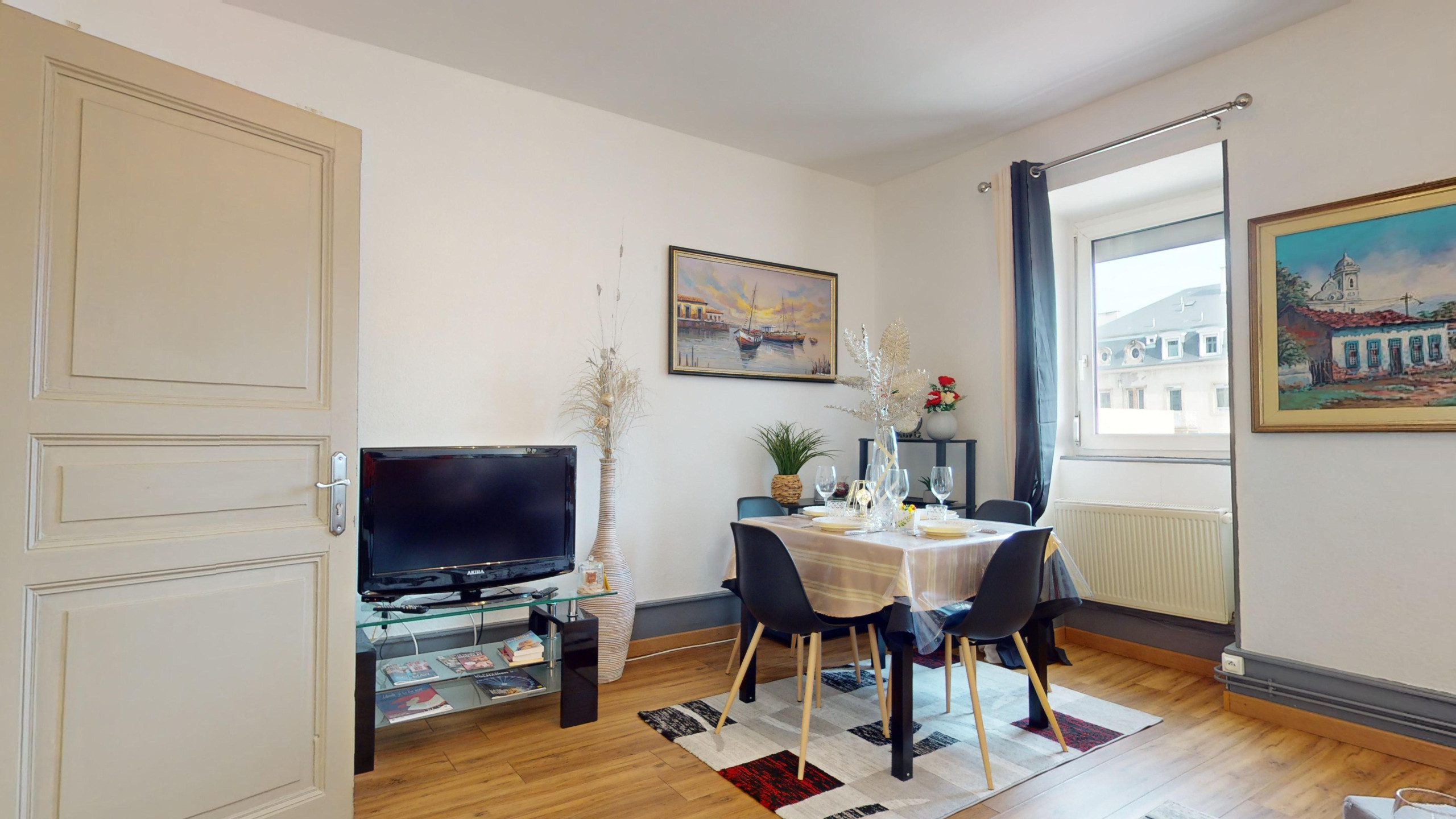 🛋️ d'un espace salon / salle à manger avec un canapé, des assises complémentaires, une télévision et une table à manger de quatre personnes