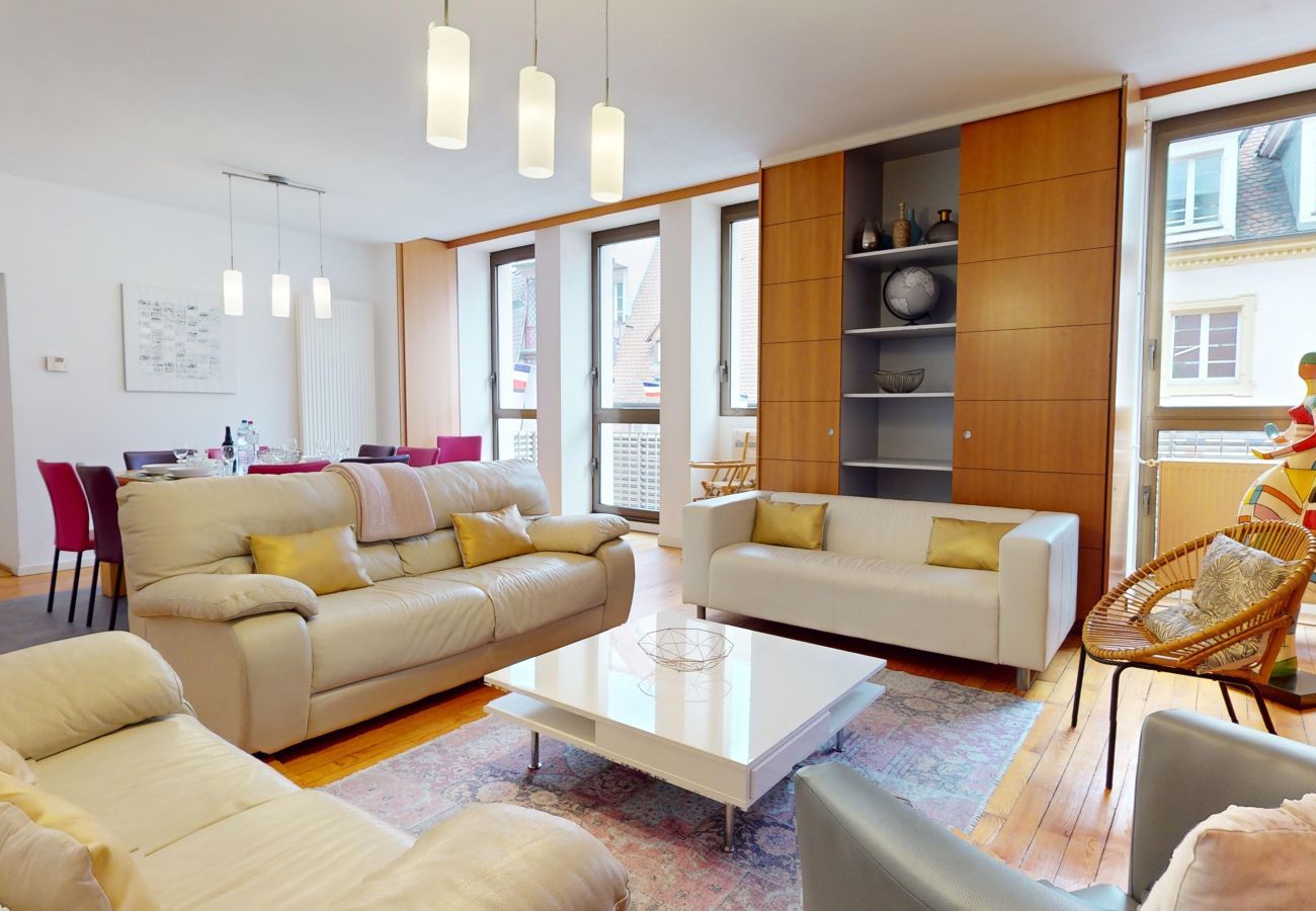 🥨 Au cœur du centre-ville de Colmar, l’appartement ZELLER de 182m2 est idéal pour un séjour en famille, entre amis, entre collègues, pour un week-end, des vacances ou le travail. Avec ces 4 chambres ainsi que ces 3 salles de bain l'appartement peut accueillir jusqu'à 9 personnes.
