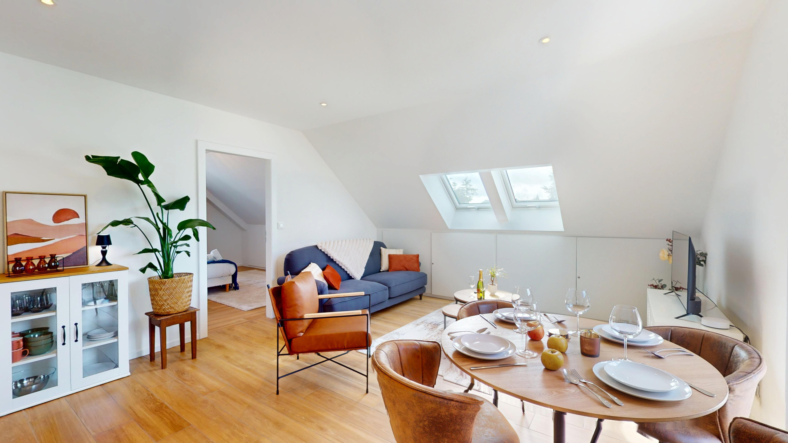 Le logement offre une pièce de vie conviviale et agréable, parfaite pour se détendre après une journée de découverte dans les villages alsaciens. Vous pourrez y profiter d’un espace salon avec télévision ainsi que d’un coin repas pour partager un moment autour d’un dîner ou d’un petit-déjeuner.