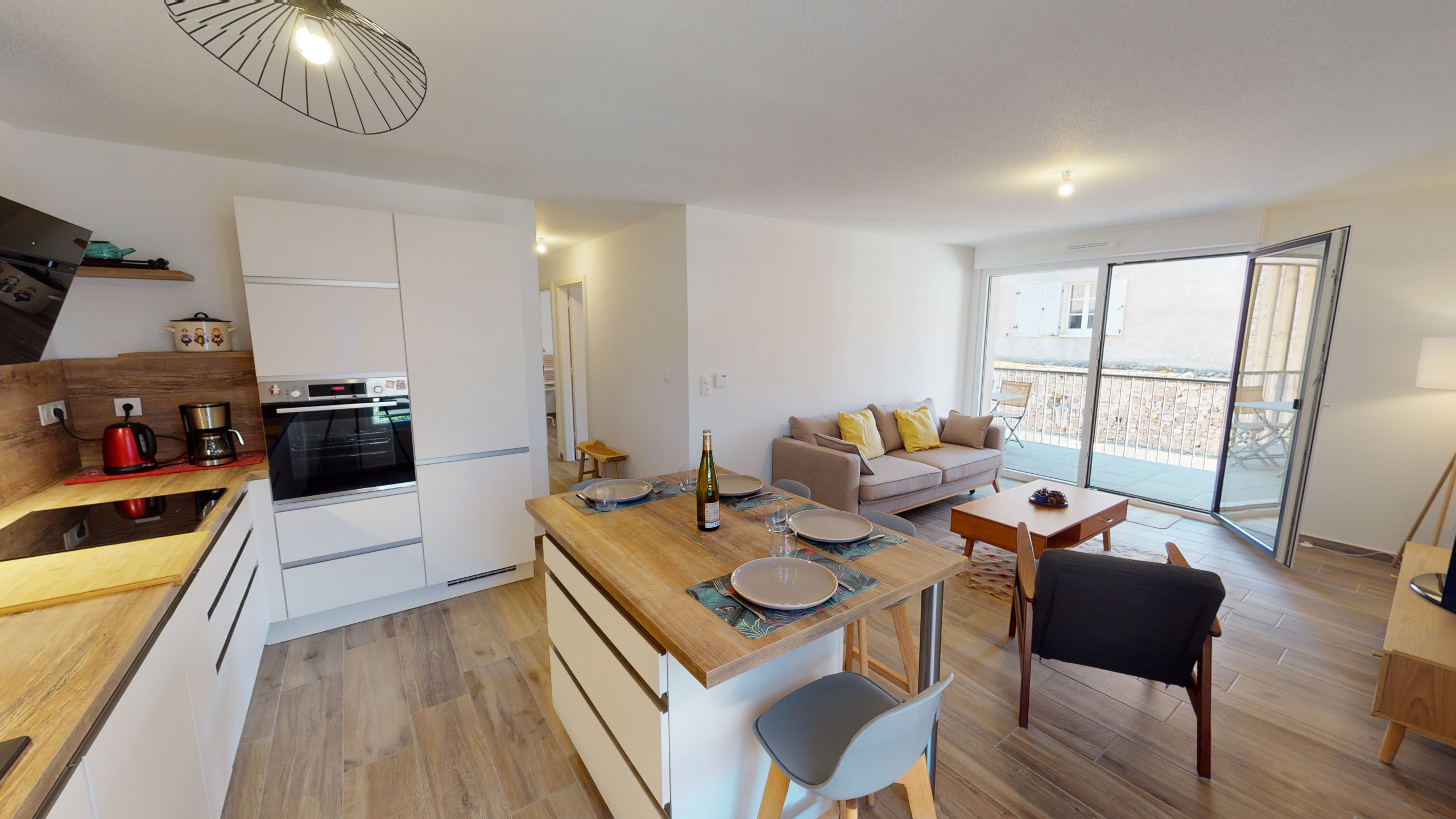 Il dispose 🍽️ d'une cuisine américaine ( réfrigérateurr/congélateur, plaque de cuisson, four, lave vaisselle, bouilloire, cafetière Nepresso classique, grille pain) avec un ilot central pour partager vos repas.
