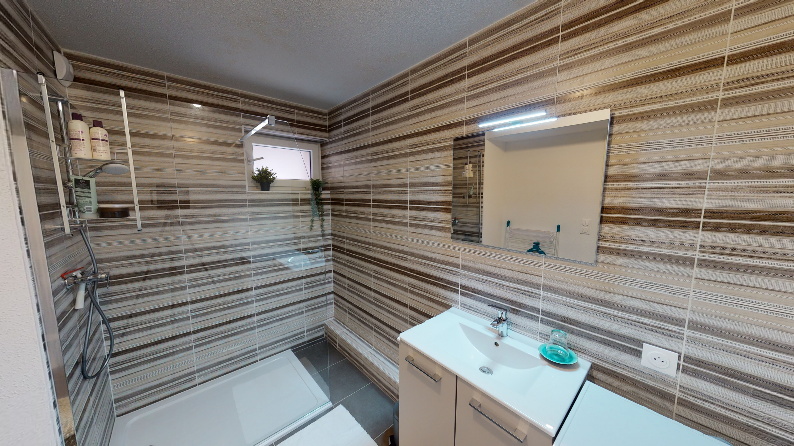 🚿 Dans la salle de bain, il y a une douche et une machine à laver le linge séchant.