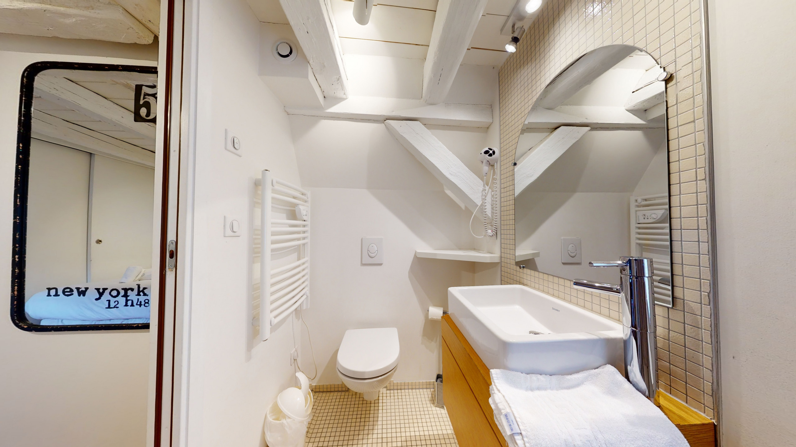 - Chambre climatisée avec lit double non séparable donnant sur une salle de bain avec douche à l'italienne et toilettes.
