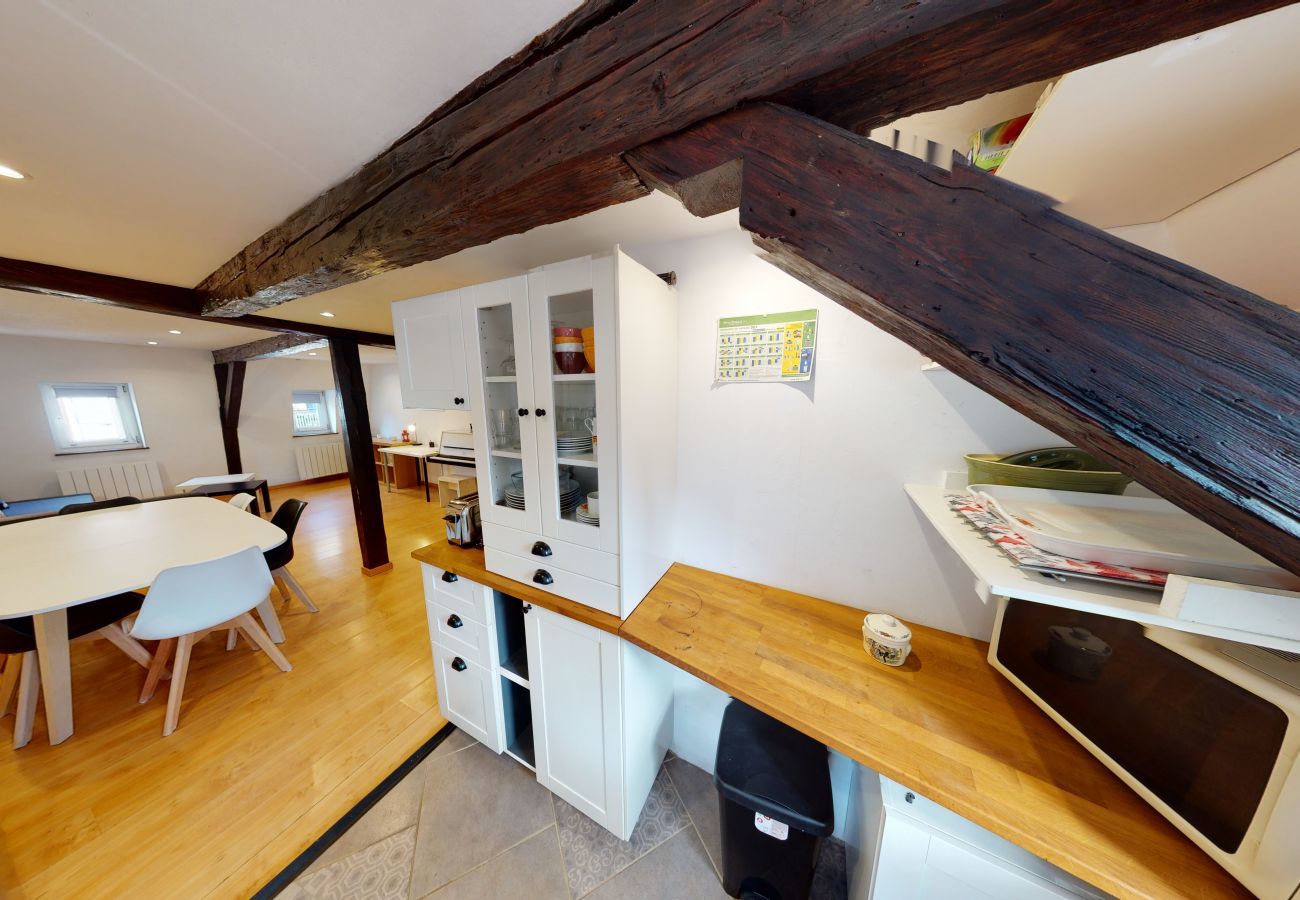 🏠 Dès l'entrée, plongez dans l'ambiance alsacienne 🥨: pièce à vivre entièrement ouverte sur la cuisine 🍴 avec poutres apparentes.