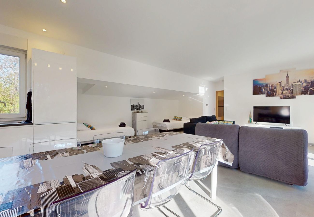 Ainsi qu'un salon lumineux avec télévision (un canapé lit double et deux lits simples s'y trouvent) et ouvert sur la terrasse