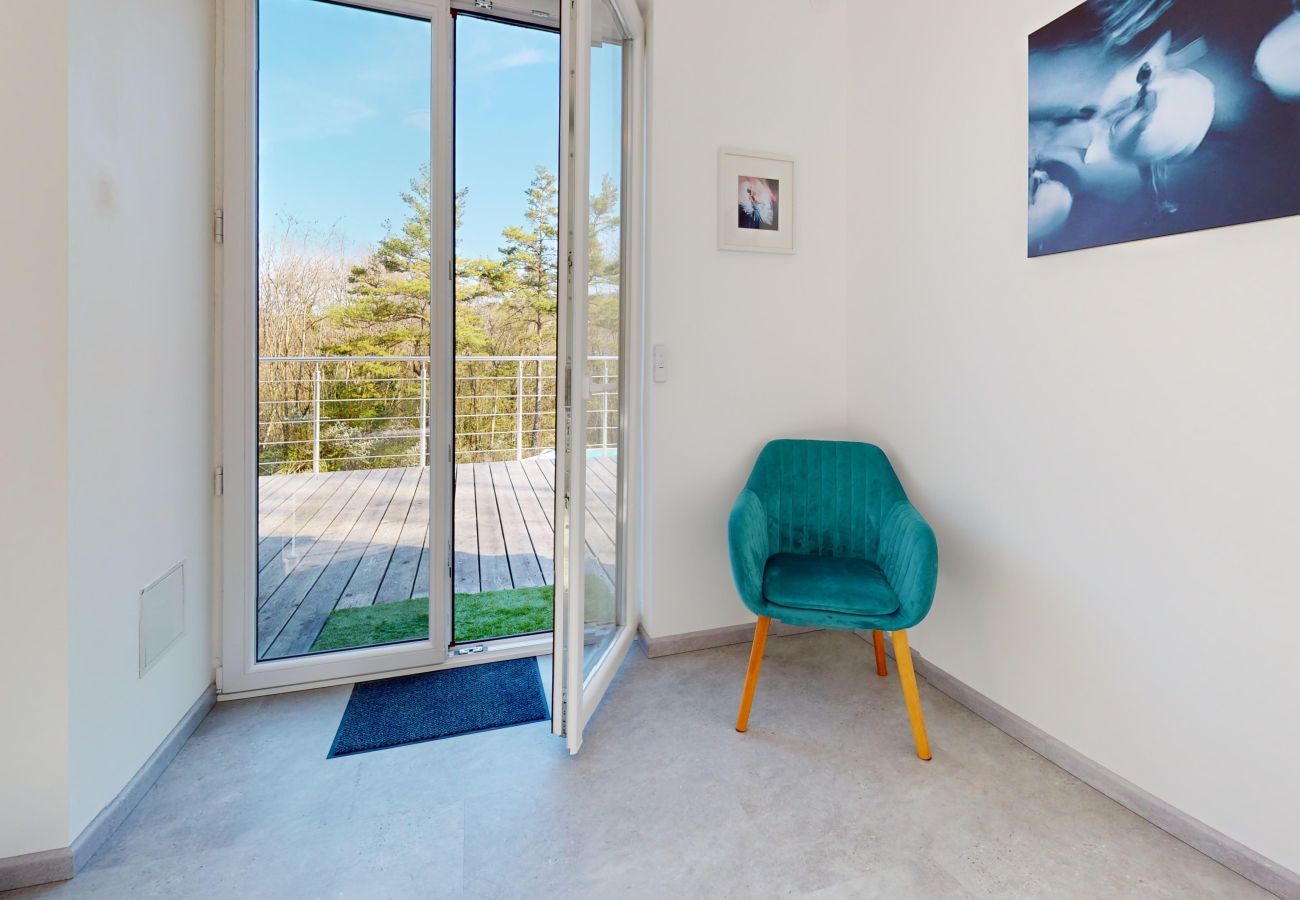 De voorzieningen buiten: groot zwembad, groot terras, veel zit- en ligmogelijkheden Moderne chalet binnenin |