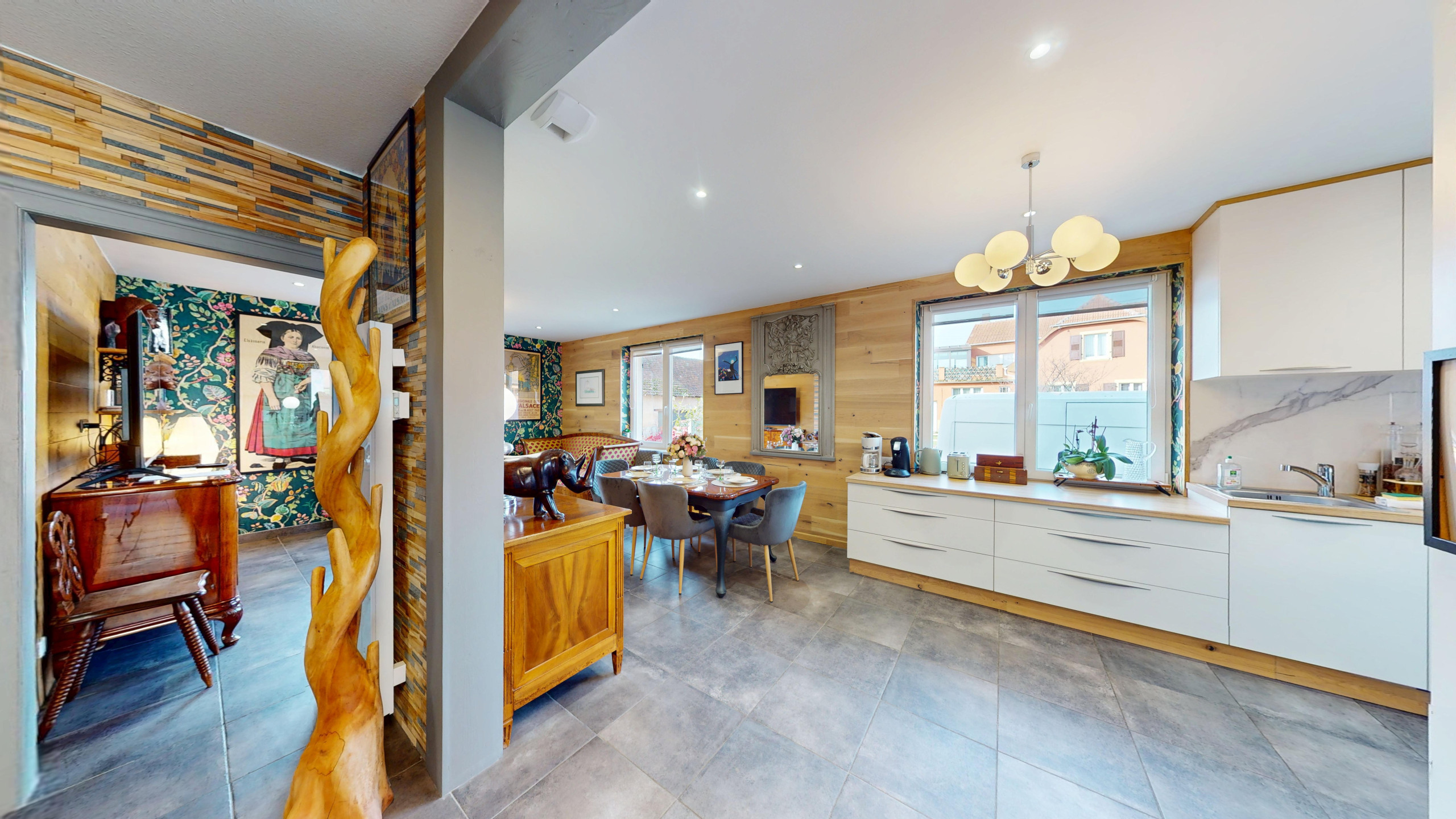 🛋️ Salon composée d’un canapé d'une table à manger et chaises, d’une télévision à écran plat.