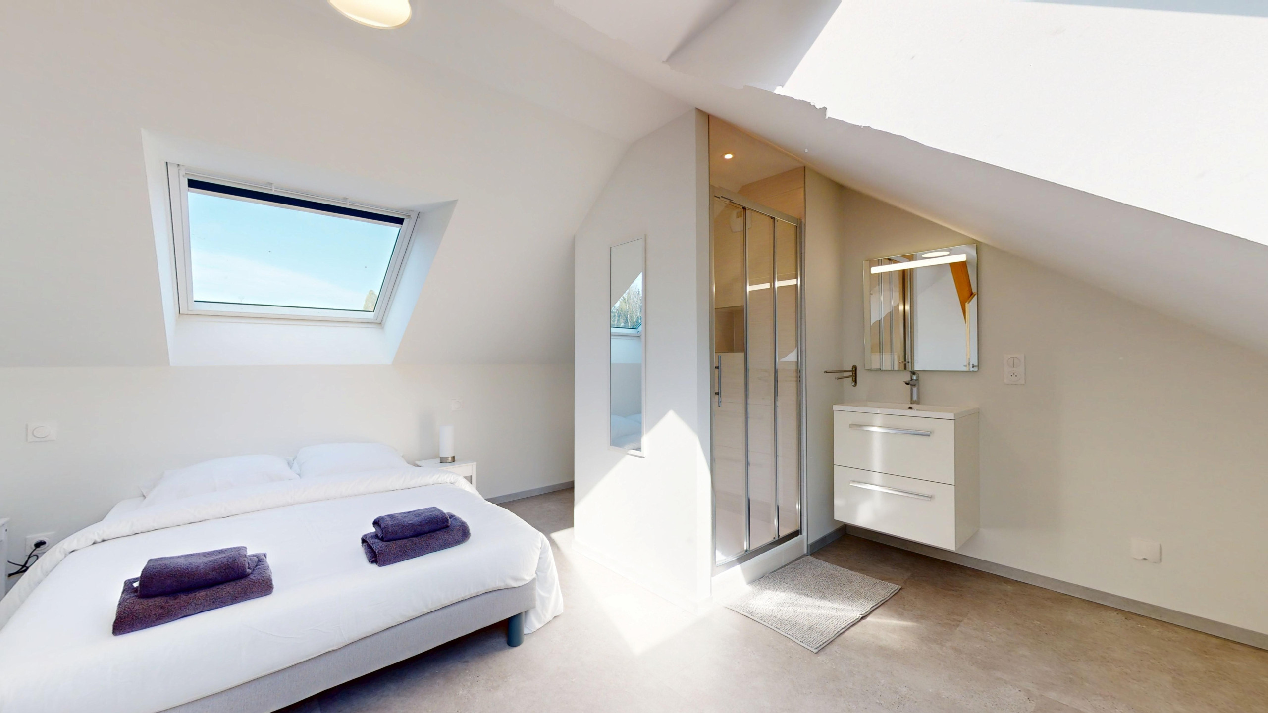 🛏️🚿 一间带有双人床、储物空间以及淋浴/洗手池和镜子的卧室。