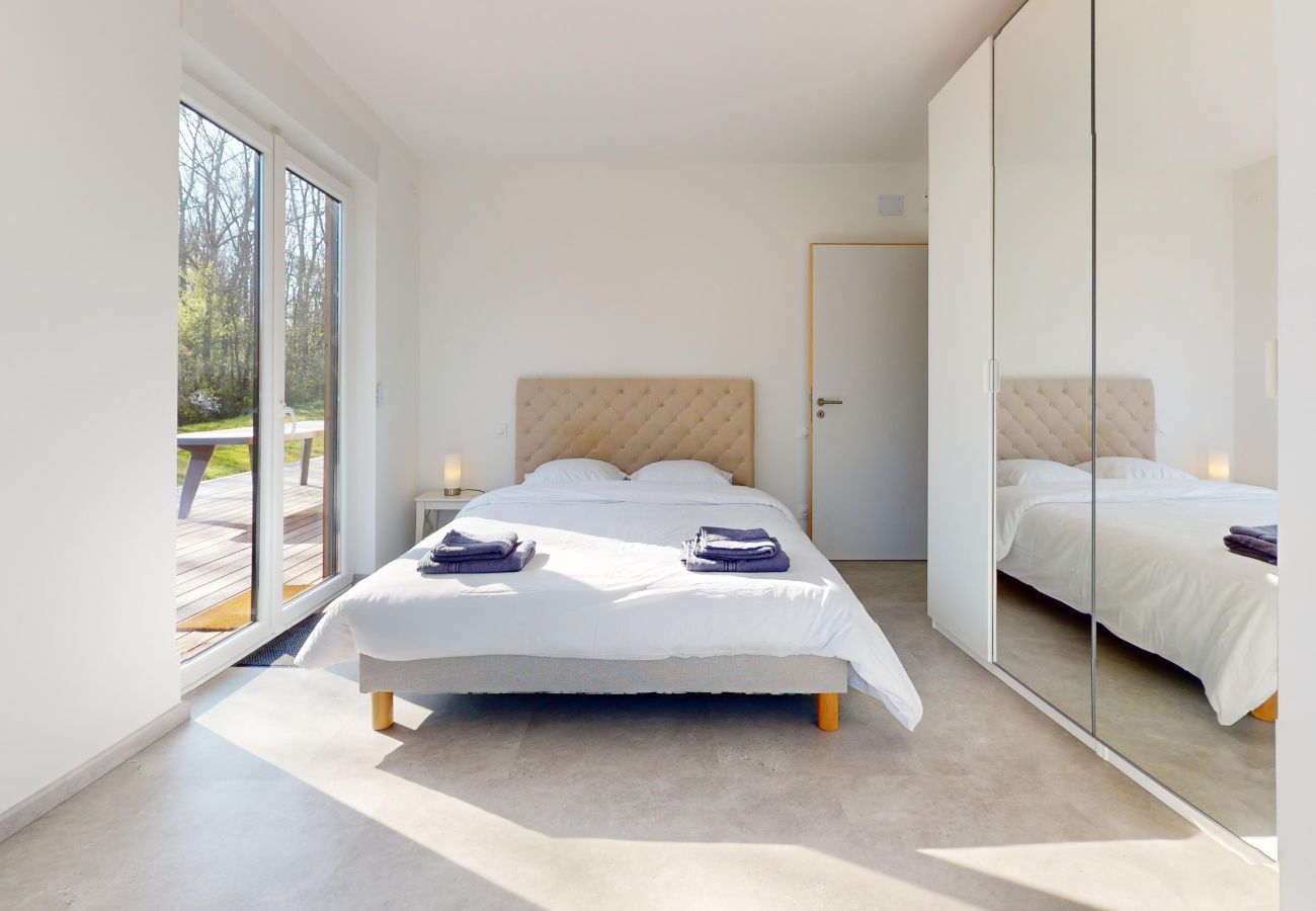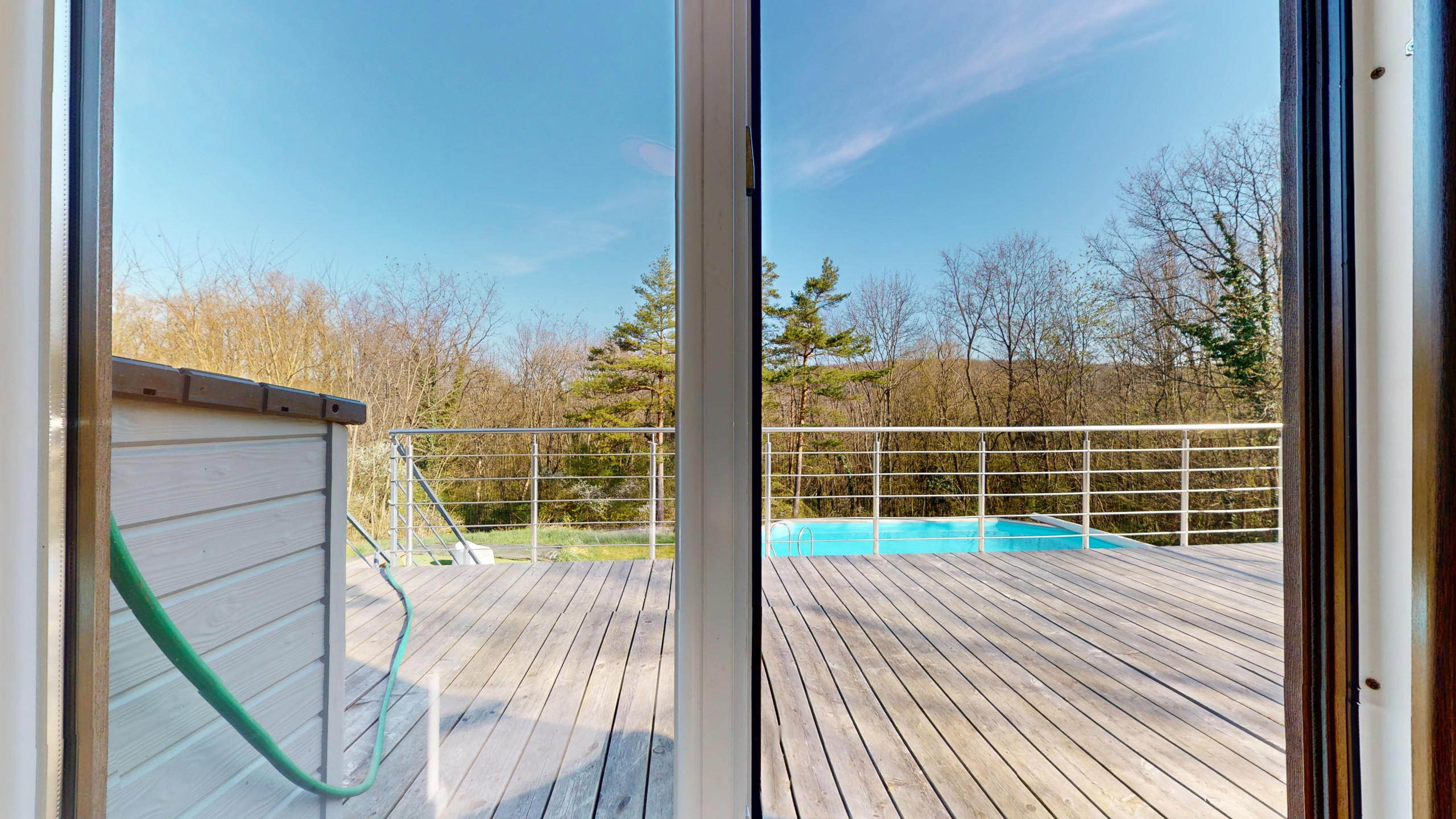 De voorzieningen buiten: groot zwembad, groot terras, veel zit- en ligmogelijkheden Moderne chalet binnenin |